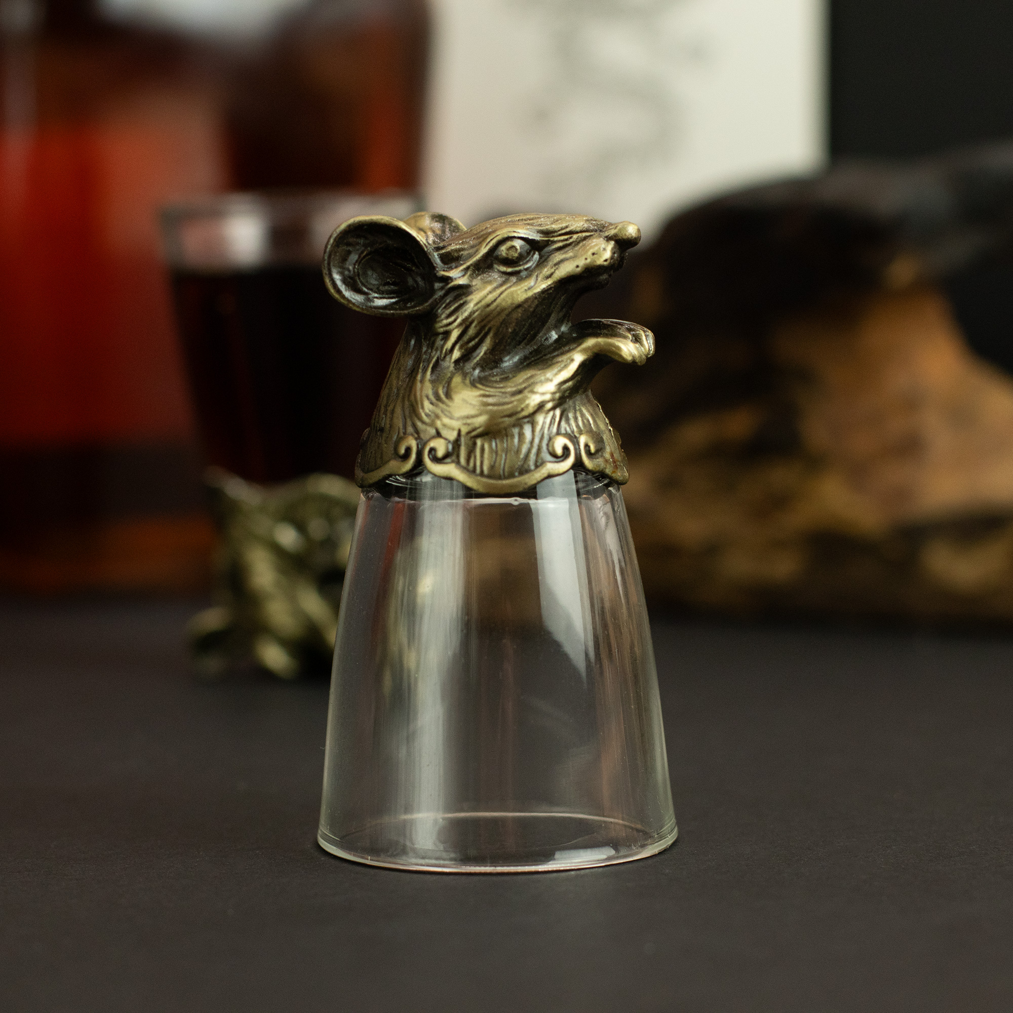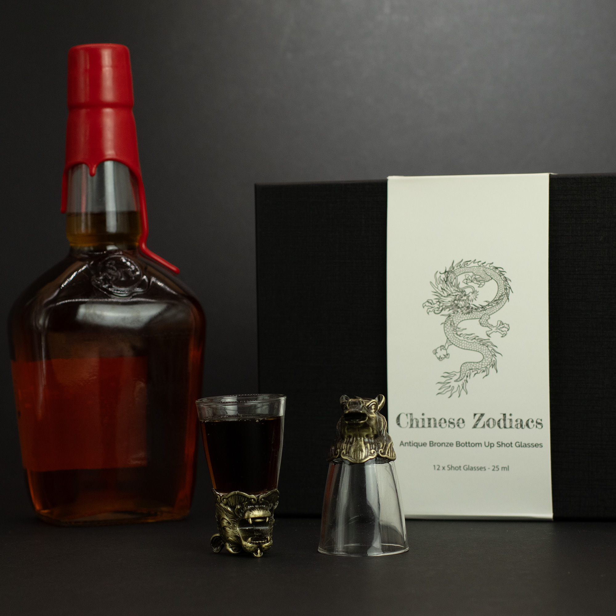 Ogni bicchierino da 25 ml presenta una base in ottone scolpita in una delle dodici creature dello zodiaco cinese – dal drago al coniglio, dalla tigre al cavallo – con raffinati dettagli scultorei che risaltano magnificamente quando il bicchiere viene capovolto.
