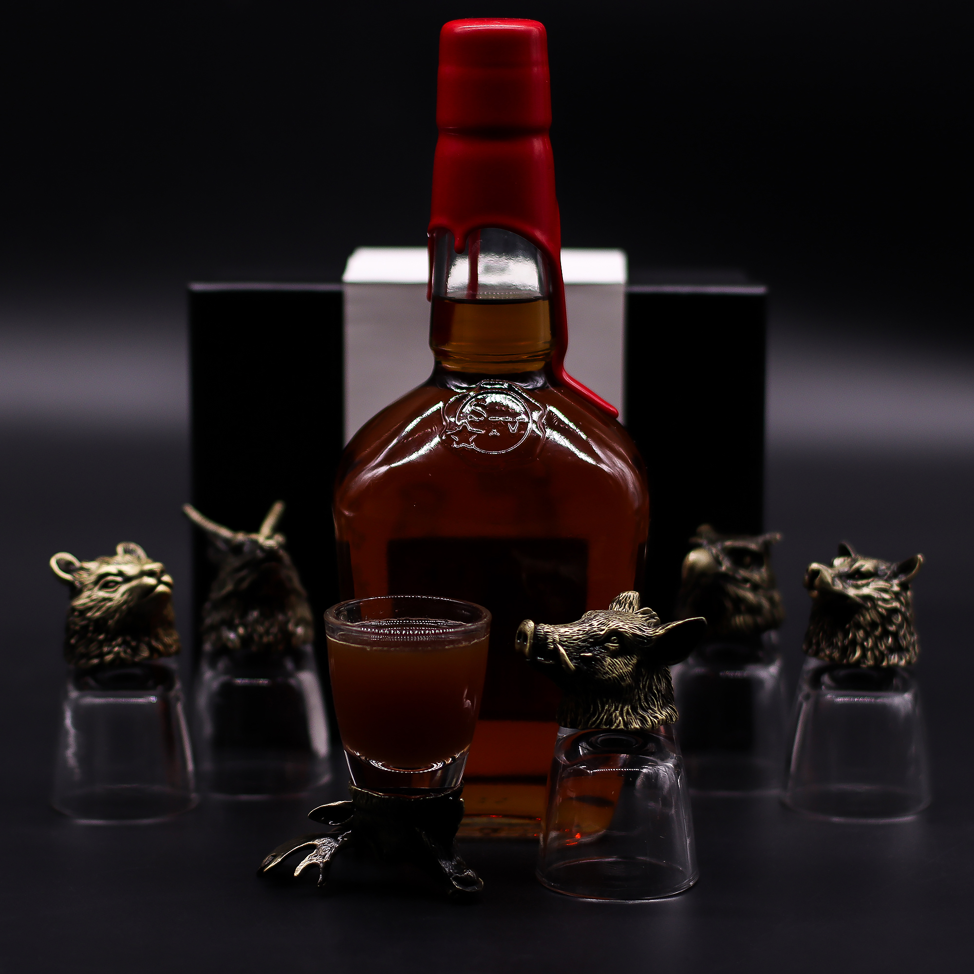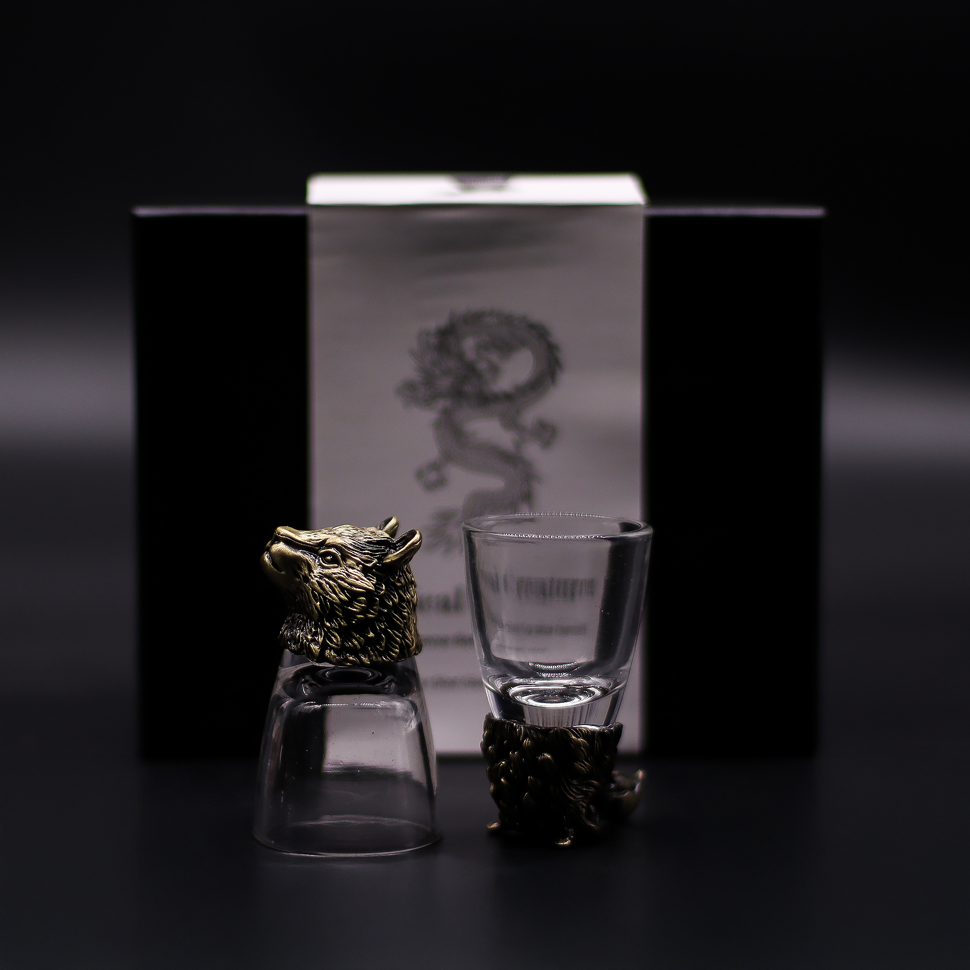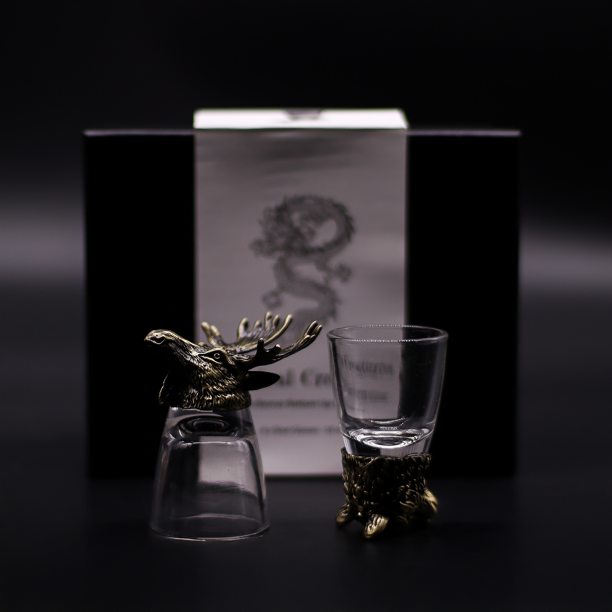 Ogni bicchierino da 50 ml poggia su una base in ottone scolpita che raffigura animali della foresta come cervo, orso, aquila, capra, cinghiale e lupo. Quando viene capovolto, ogni bicchiere rivela la figura in tutti i suoi dettagli, trasformandosi in una piccola opera d’arte che funge anche da elemento decorativo.