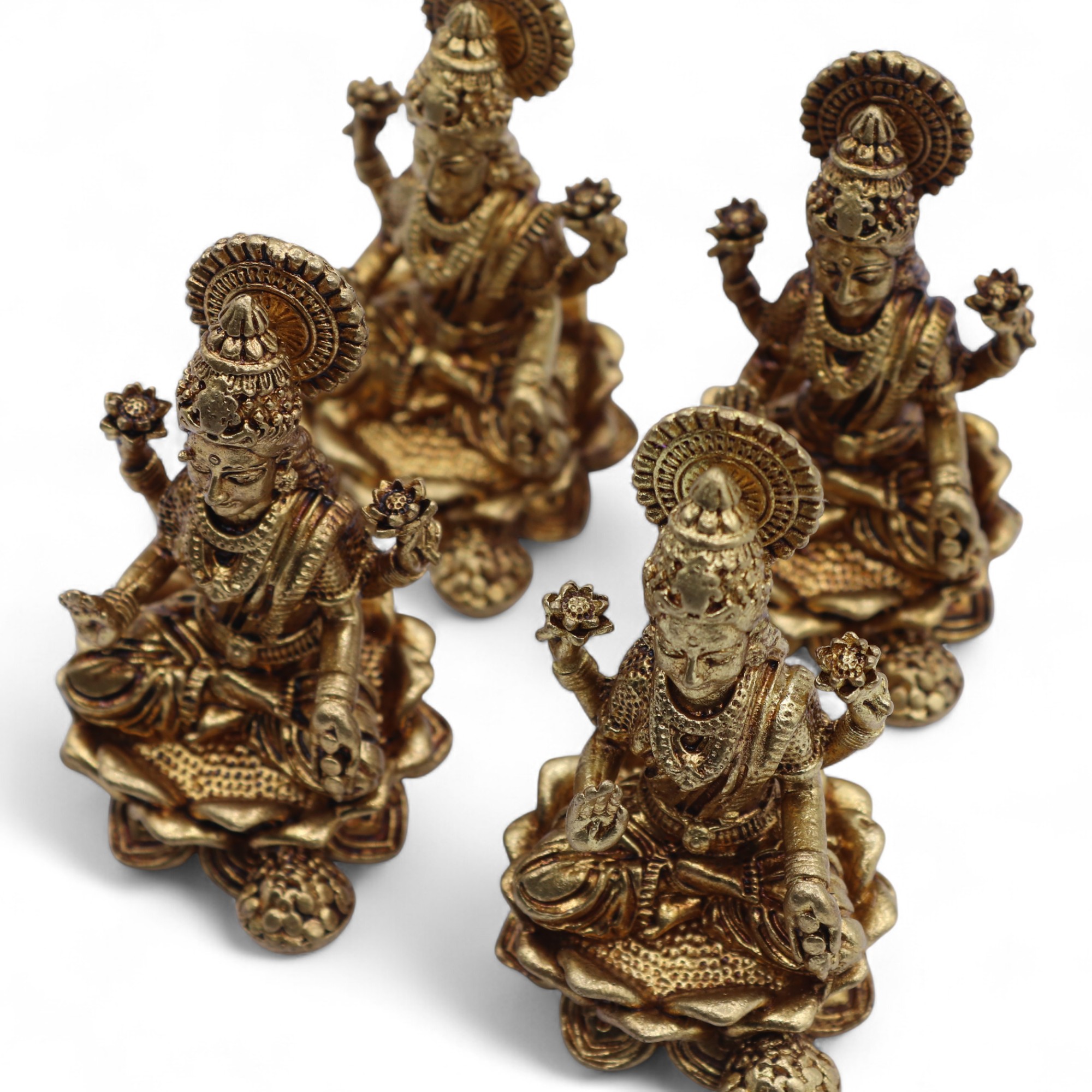 La dea Laxmi (Lakshmi) è profondamente venerata nella tradizione induista come portatrice di prosperità, ricchezza e buona fortuna. Spesso rappresentata seduta su un loto mentre dispensa benedizioni, incarna purezza, generosità e il fluire costante dell’abbondanza. Il suo culto è particolarmente sentito durante il Diwali, quando i devoti invocano armonia e benessere per l’anno successivo.