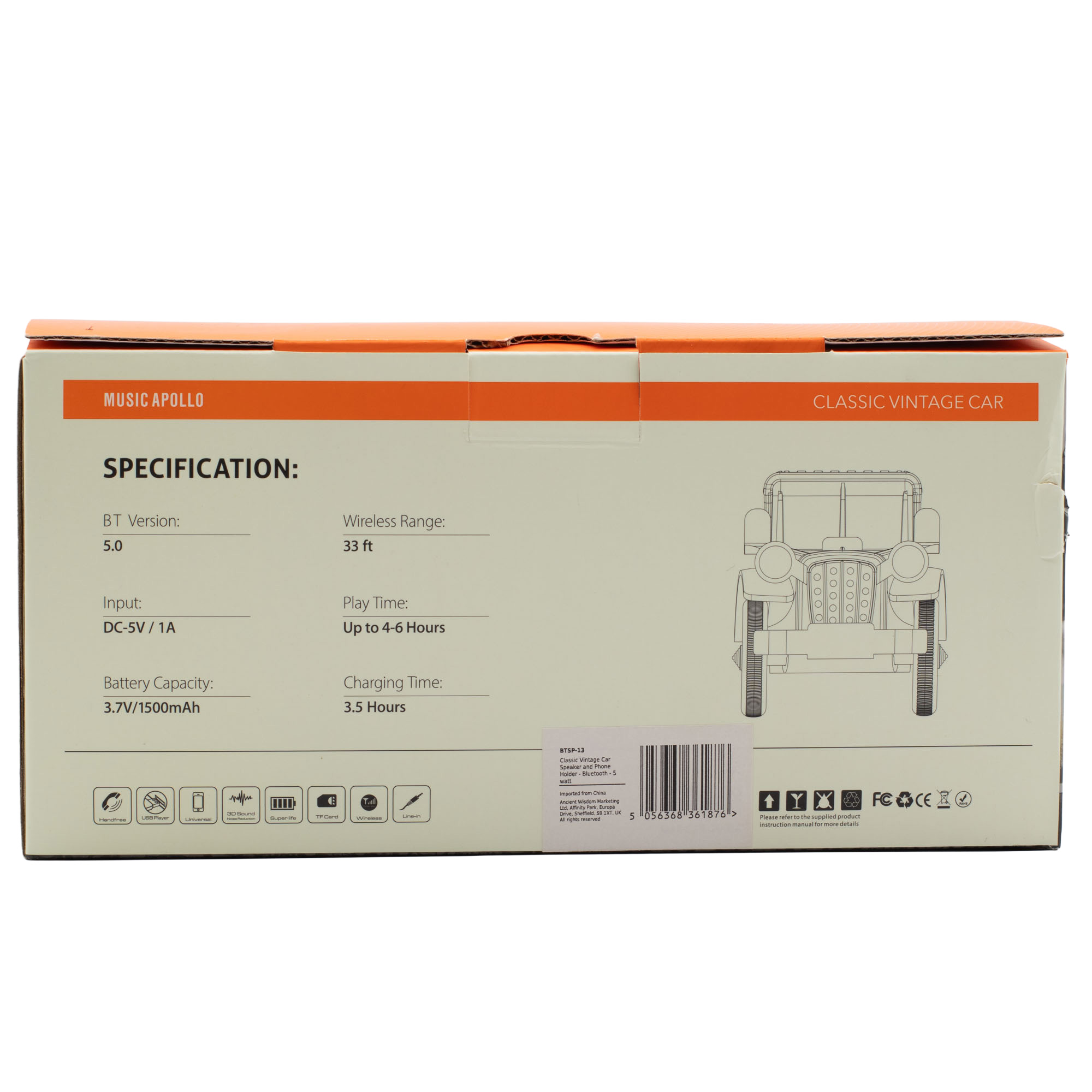 Mini Cassa Bluetooth - Auto d’Epoca, in vendita all'ingrosso, unisce il fascino vintage delle auto d’epoca alla comodità della tecnologia moderna. Con il suo design a forma di intramontabile automobile, questo altoparlante compatto funge anche da pratico supporto per smartphone, diventando un elemento decorativo e funzionale perfetto per scrivanie, scaffali o comodini. I dettagli effetto legno valorizzano il suo carattere nostalgico, rendendolo al contempo armonioso in qualsiasi ambiente contemporaneo.