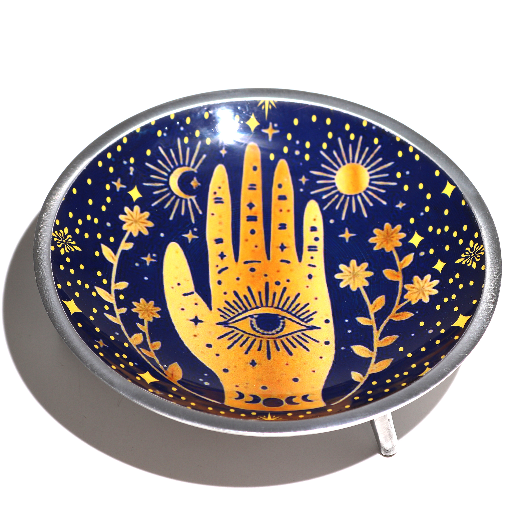 Questo piatto per rituali presenta una finitura in smalto blu notte ed è decorato con il simbolo Hamsa, tradizionalmente legato alla protezione e alle benedizioni.