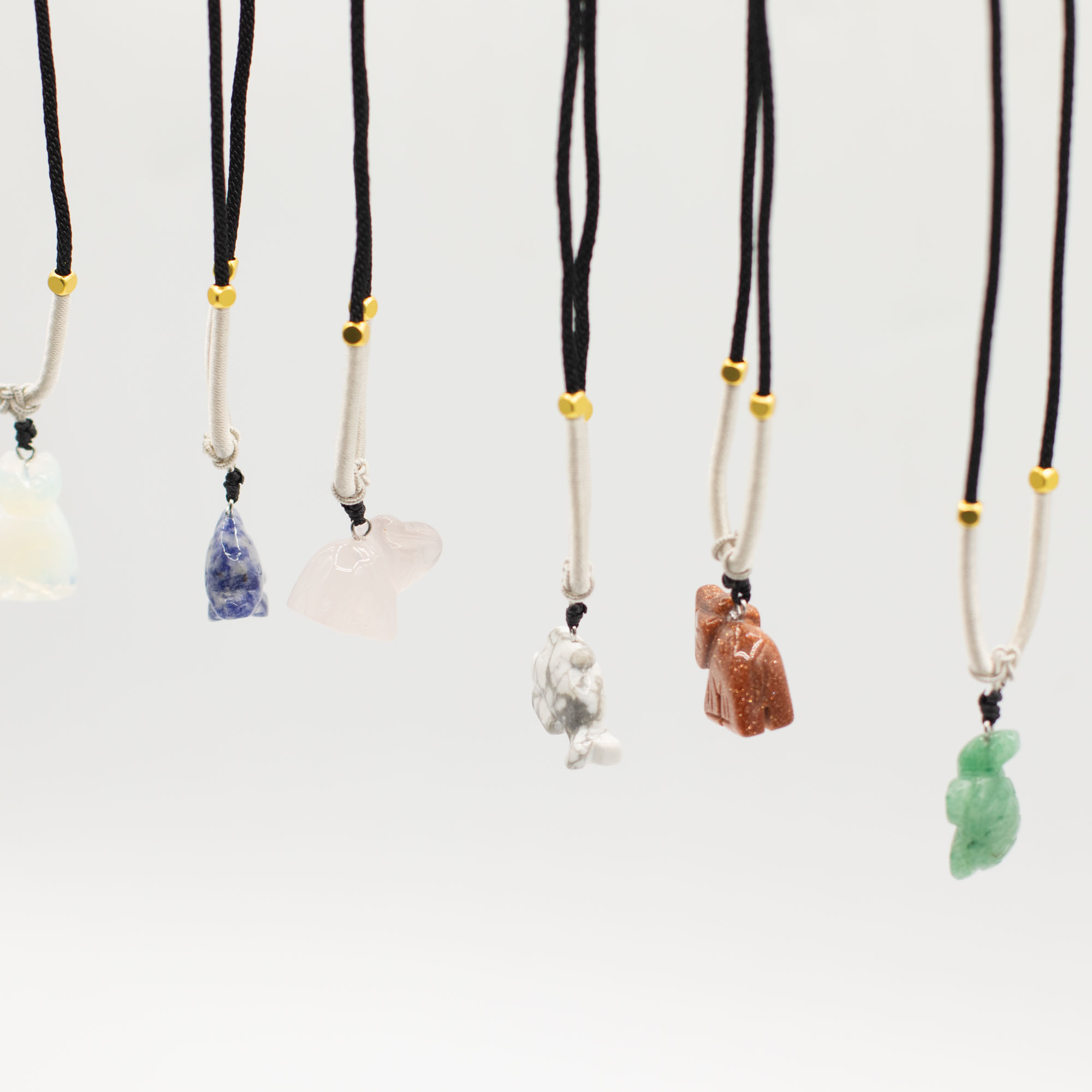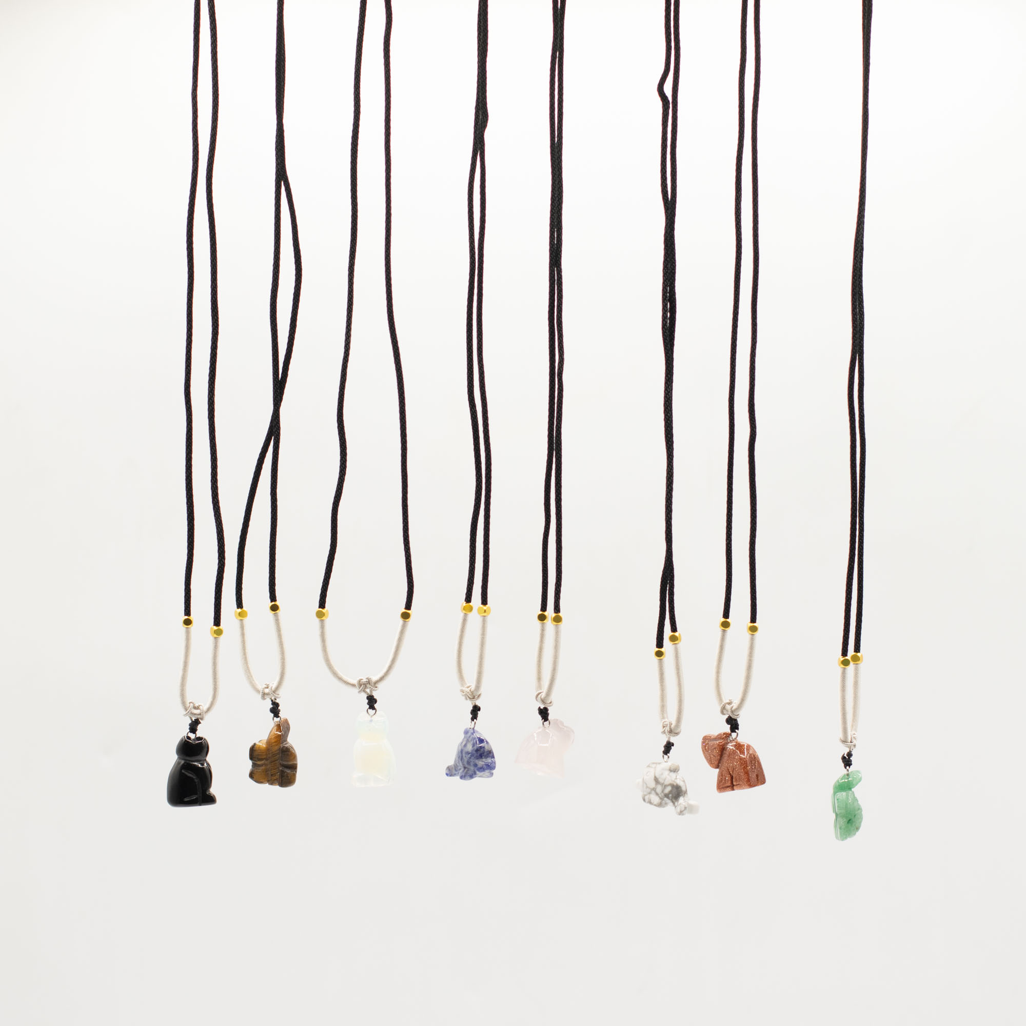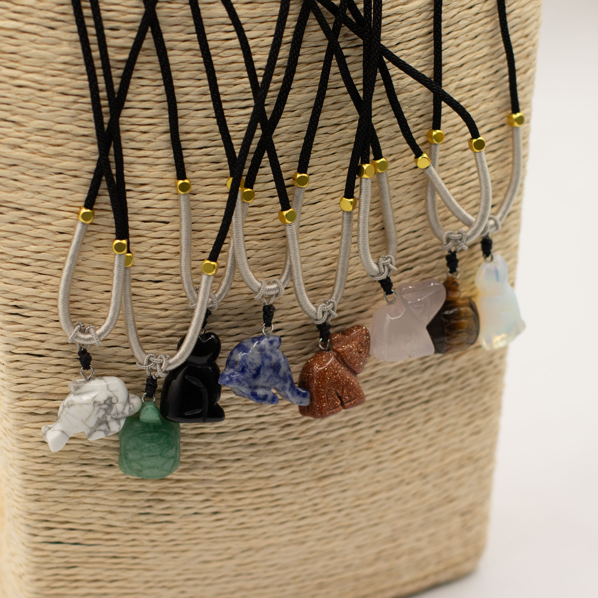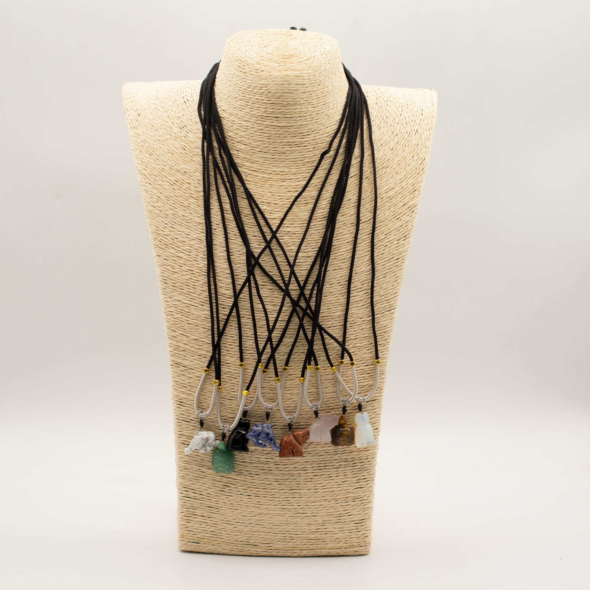L'assortimento include una gamma di animali come elefanti, tartarughe, delfini, gatti e altre creature molto amate. Ogni pezzo è scolpito in pietre semipreziose naturali, creando sottili differenze di colore, consistenza e finitura che aggiungono individualità a ogni collana.