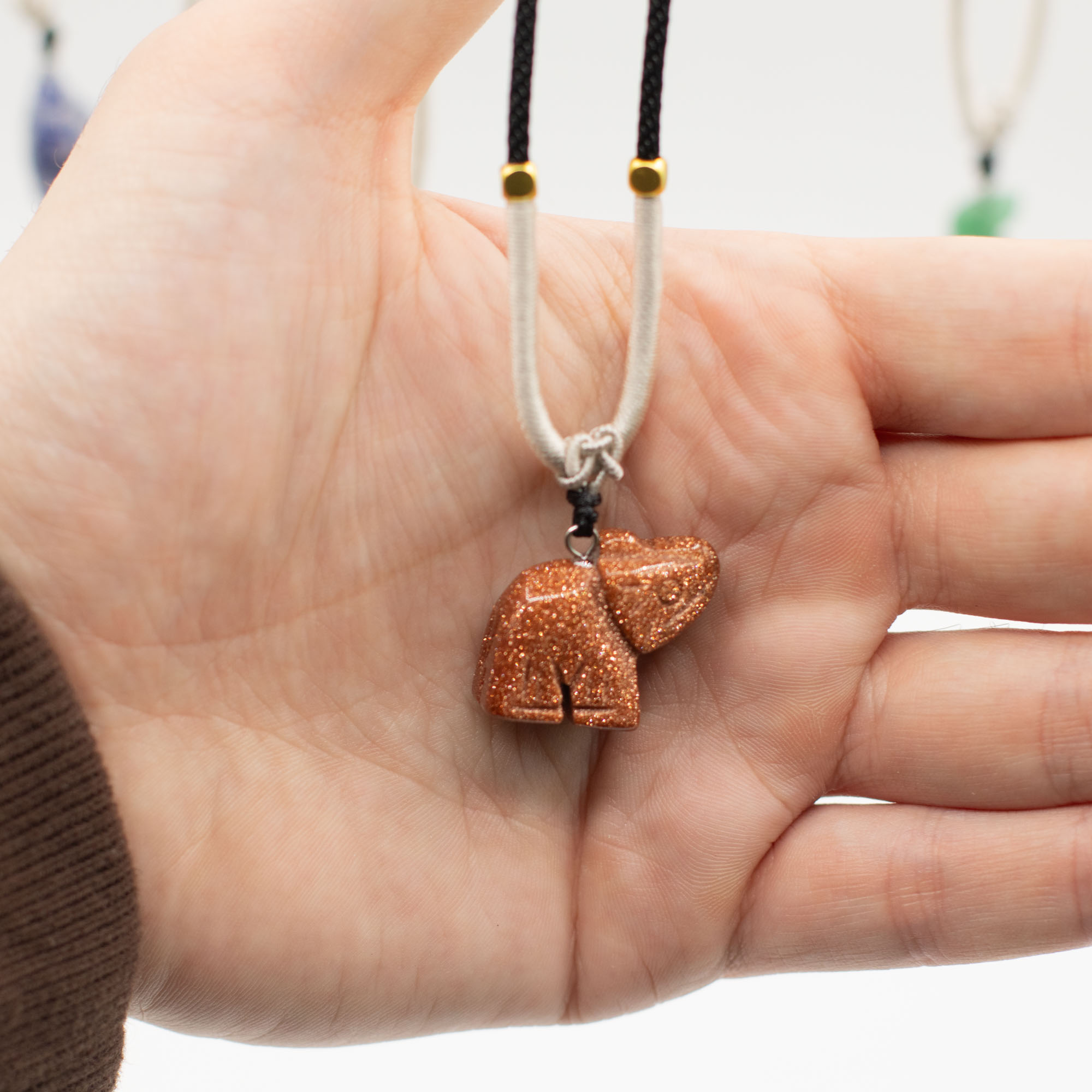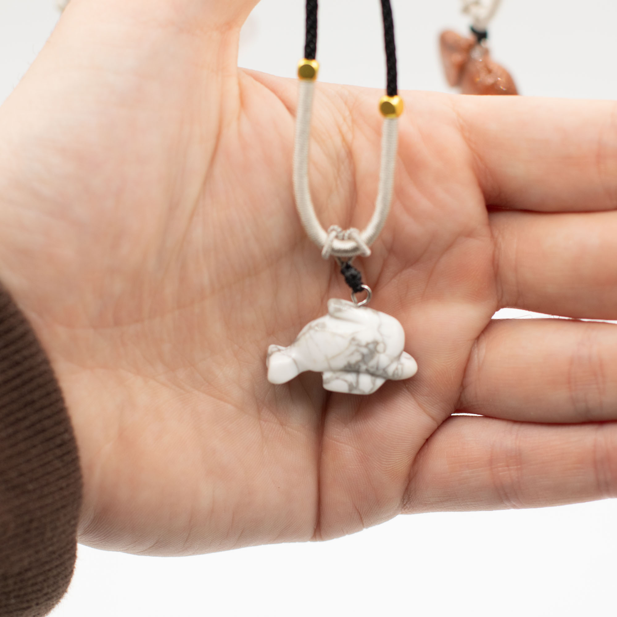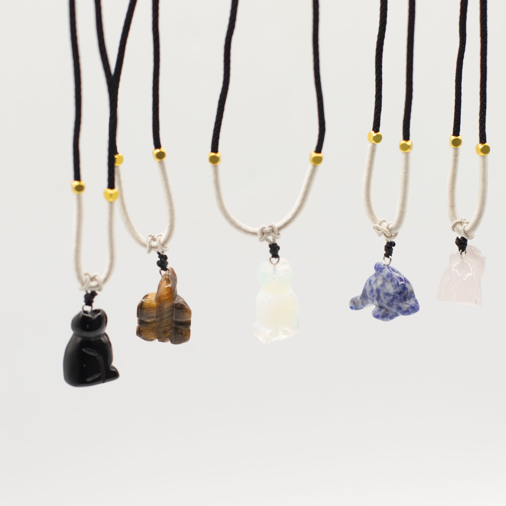 L'assortimento include una gamma di animali come elefanti, tartarughe, delfini, gatti e altre creature molto amate. Ogni pezzo è scolpito in pietre semipreziose naturali, creando sottili differenze di colore, consistenza e finitura che aggiungono individualità a ogni collana.