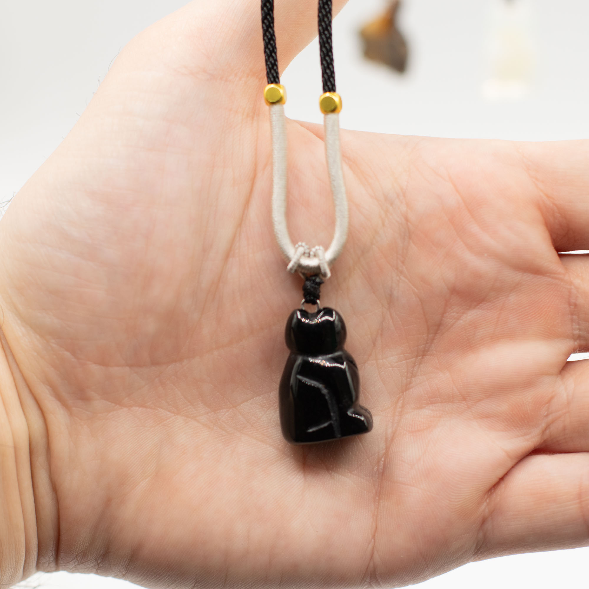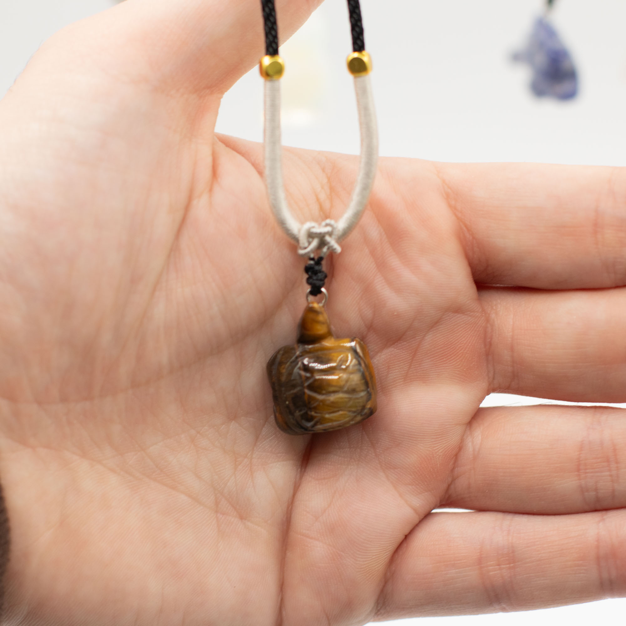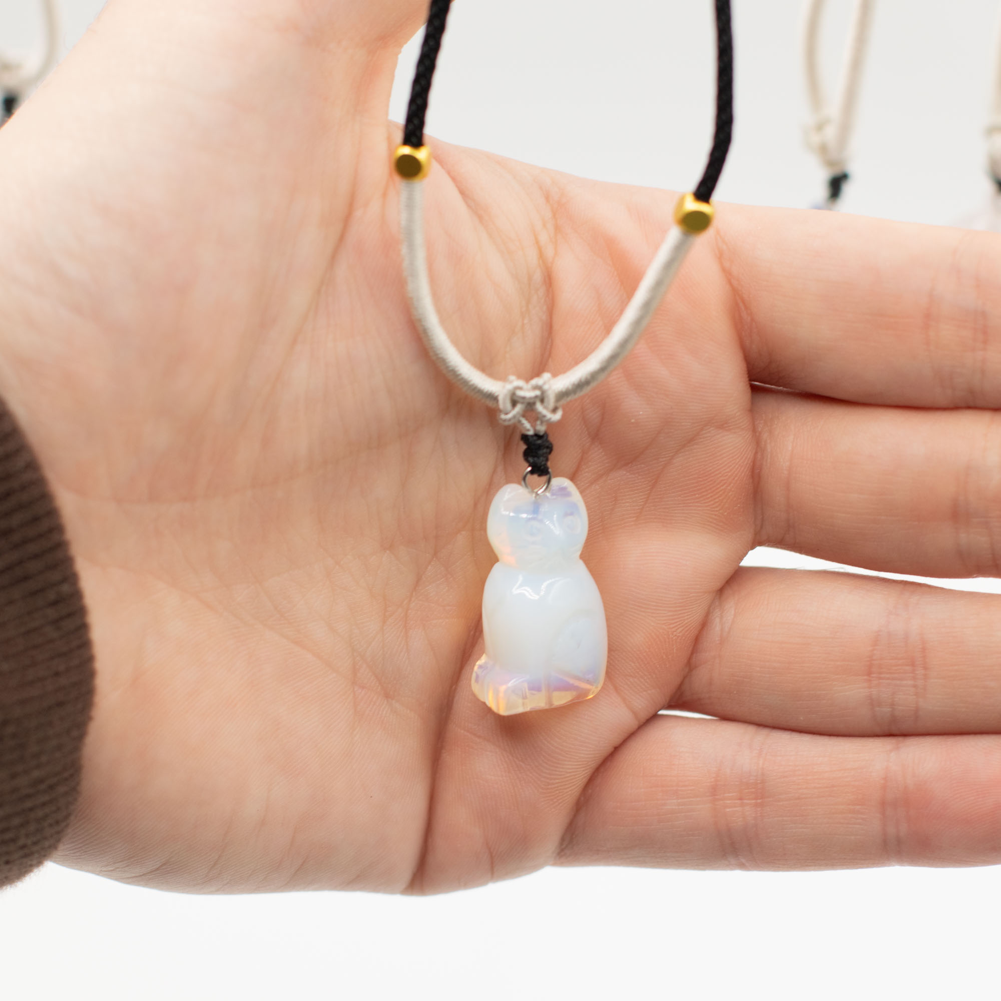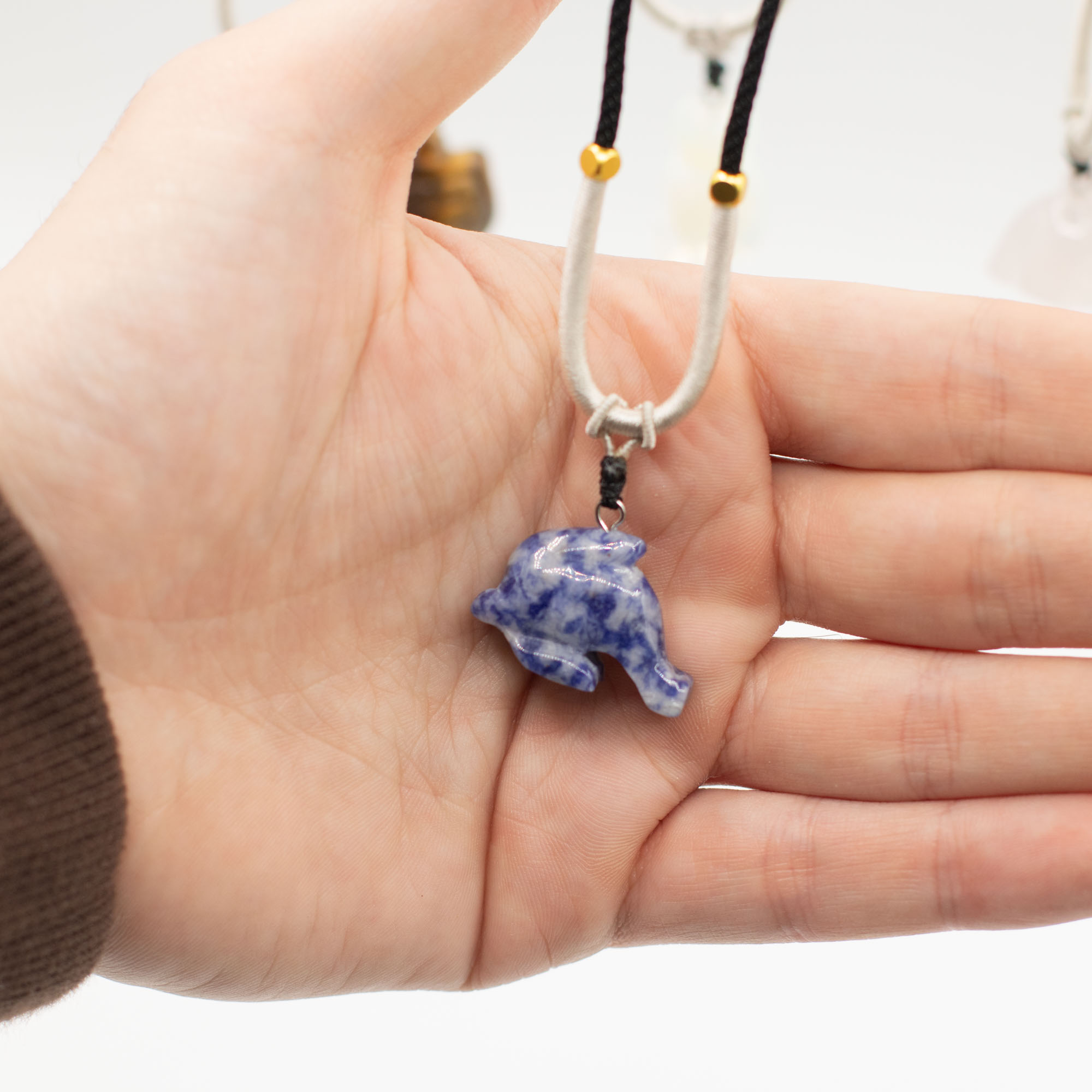 L'assortimento include una gamma di animali come elefanti, tartarughe, delfini, gatti e altre creature molto amate. Ogni pezzo è scolpito in pietre semipreziose naturali, creando sottili differenze di colore, consistenza e finitura che aggiungono individualità a ogni collana.