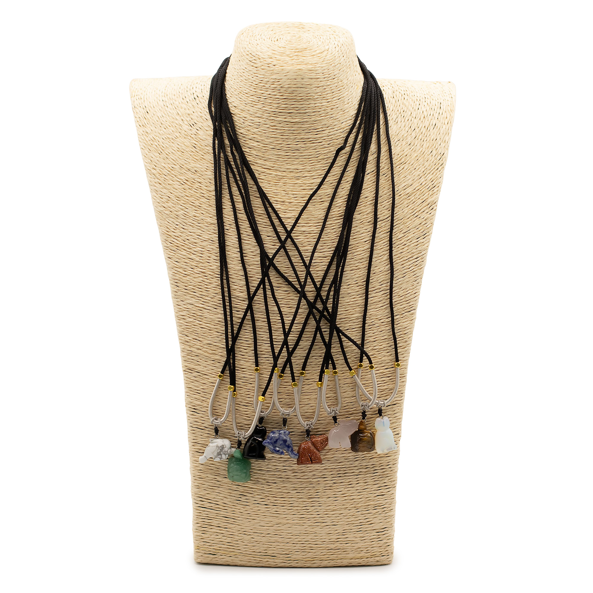 Arricchisci la tua selezione di gioielli con le collane con cordino e pendenti semipreziosi - Collezione Animali, all'ingrosso B2B. Questo set unisce pendenti con pietre semipreziose intagliati a mano, modellati a forma di popolari figure di animali, offrendo un forte impatto visivo per rivenditori di articoli da regalo, cristallerie e boutique.