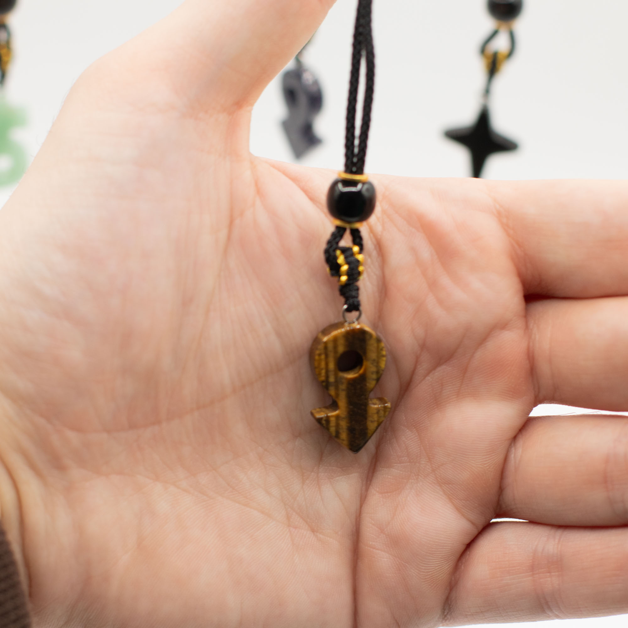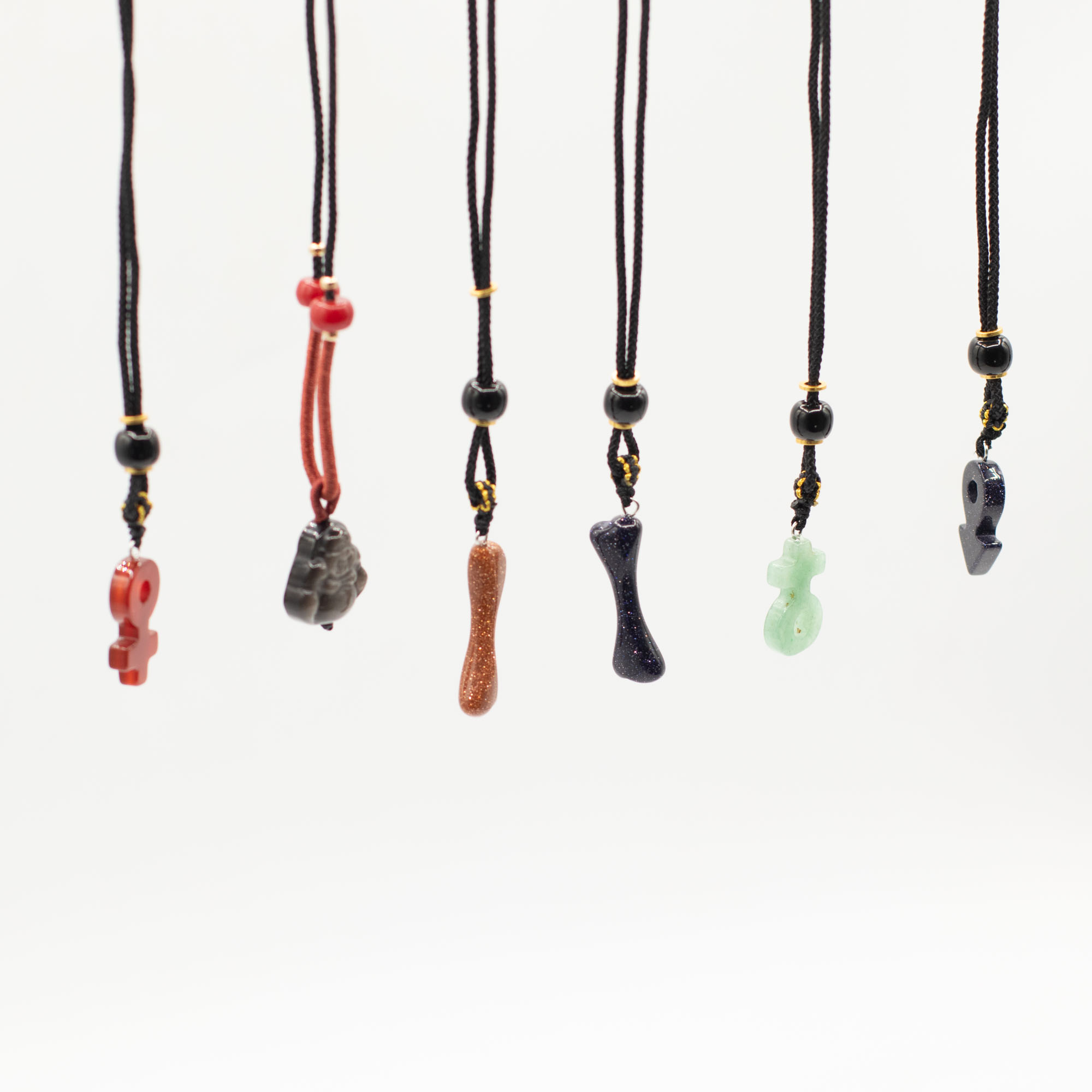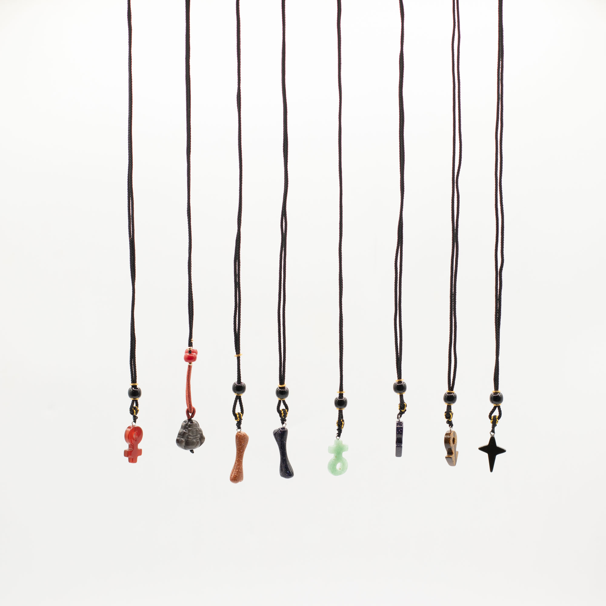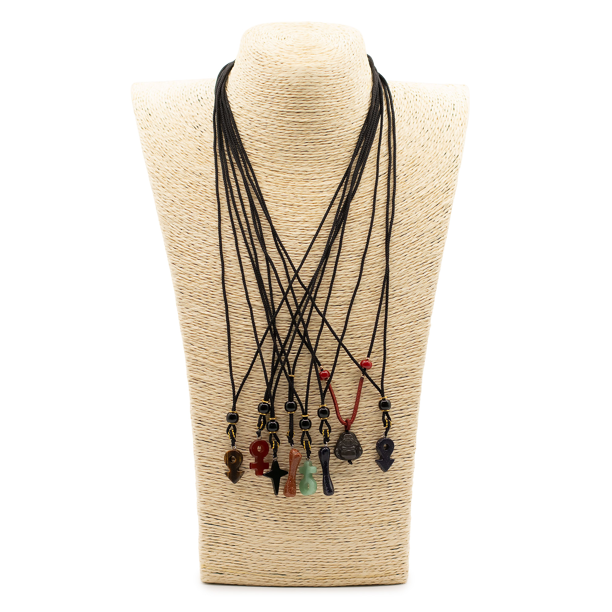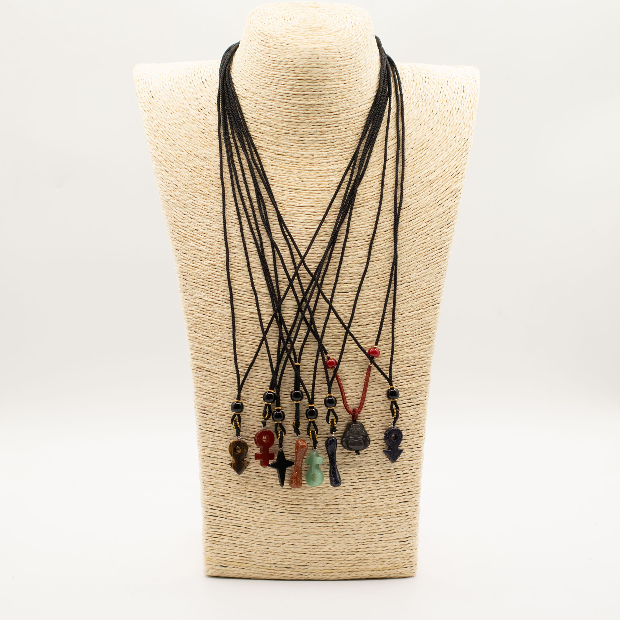 L’assortimento comprende motivi iconici come croci, emblemi simbolici, figure di Buddha e altre forme significative, ciascuno scolpito in pietre naturali. Le variazioni di colore, venatura e finitura conferiscono a ogni pendente un carattere unico, esaltando l’autenticità e il fascino intrinseco di ogni pezzo.