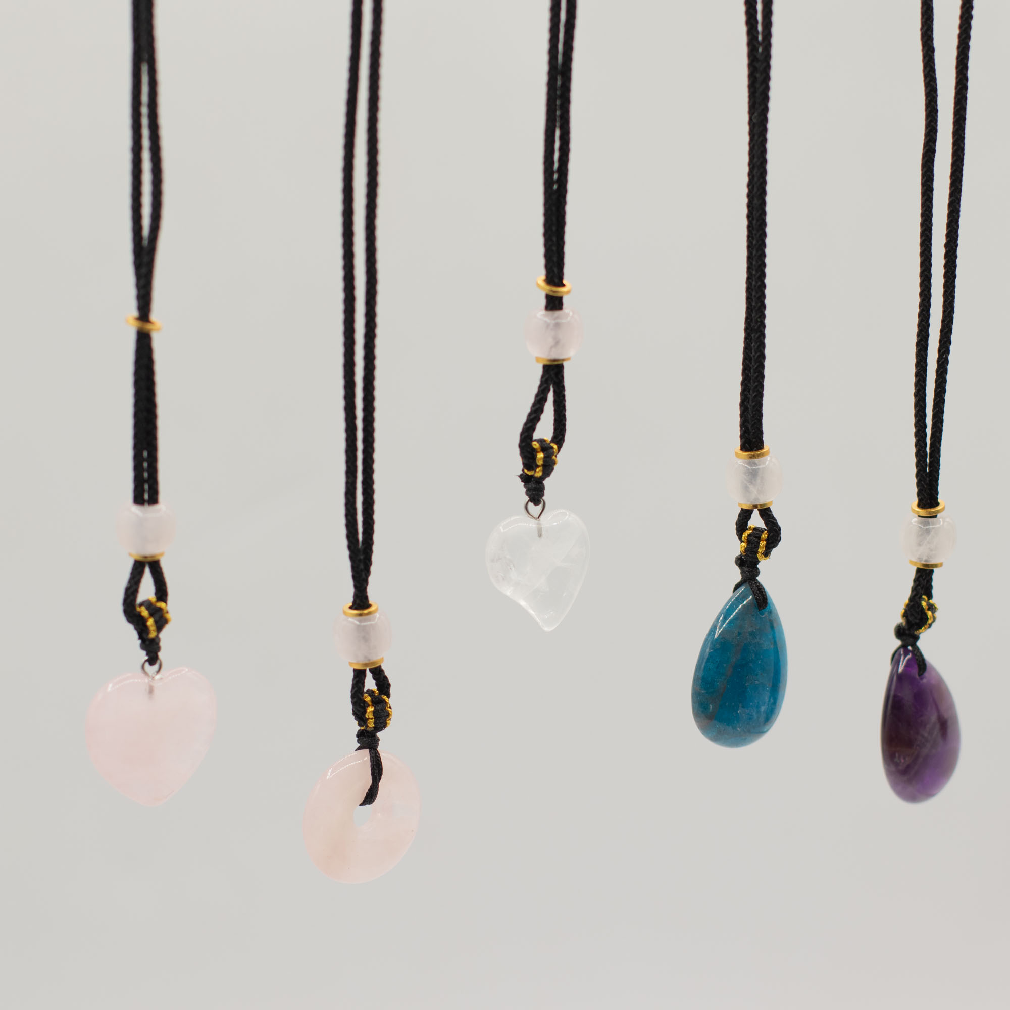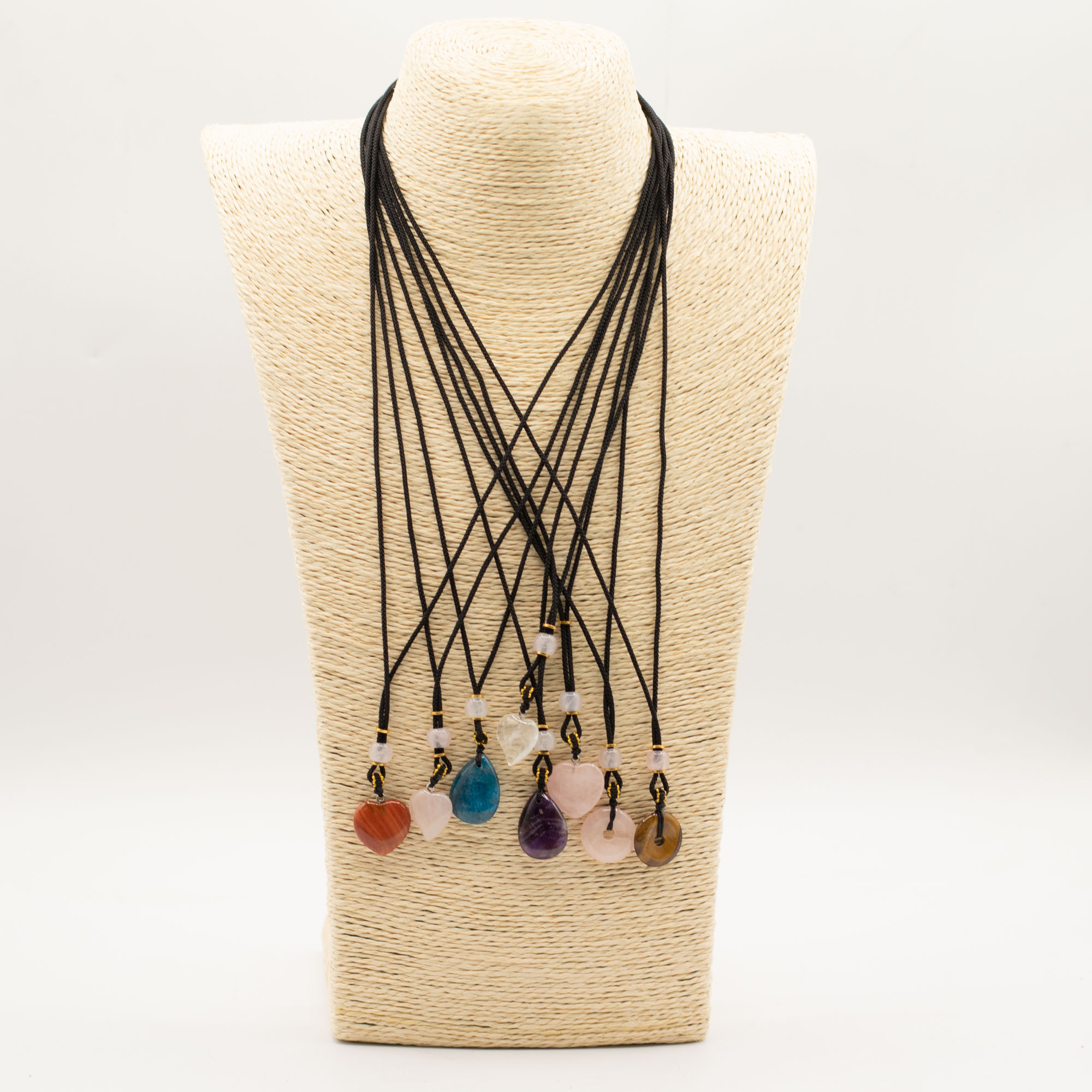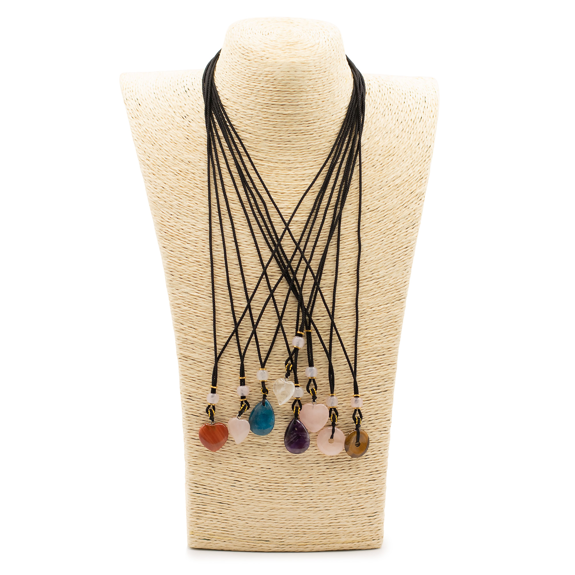 Scopri un’opzione di gioielleria delicata e piena di significato con le collane con cordino e pendenti con pietre semipreziose – Collezione Cuori & Altro, in vendita all'ingrosso. Questo set mette in risalto pendenti in pietre semipreziose naturali lucide, con forme a cuore e design morbidi e fluidi, perfetti per negozi di articoli da regalo, rivenditori di cristalli e boutique.