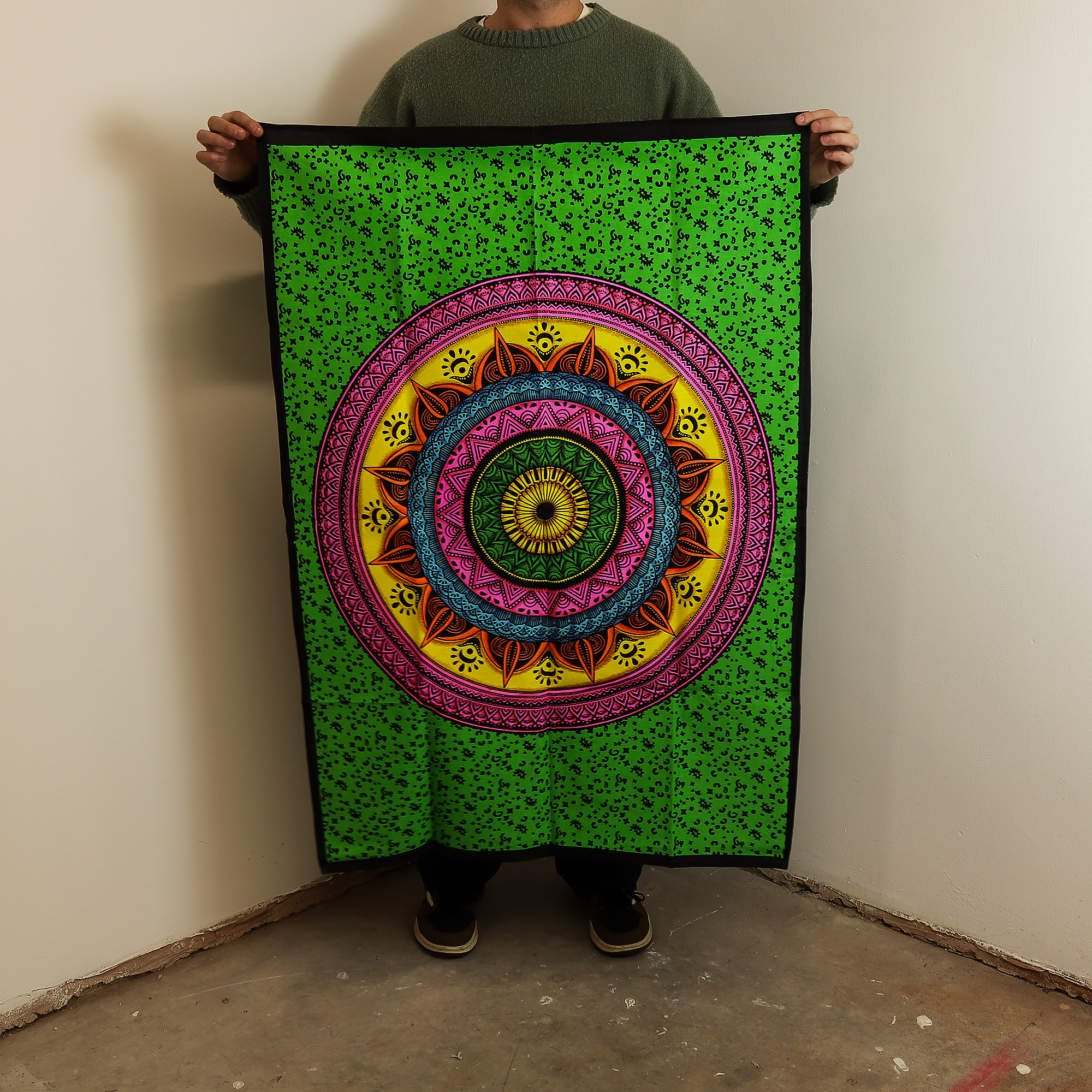 Questo vivace arazzo indiano con mandala irradia equilibrio e calma grazie alla sua simmetria circolare. Il mandala è un antico simbolo spirituale che rappresenta l’universo e la consapevolezza, molto apprezzato dai consumatori moderni in cerca di energia positiva e concentrazione negli spazi domestici.