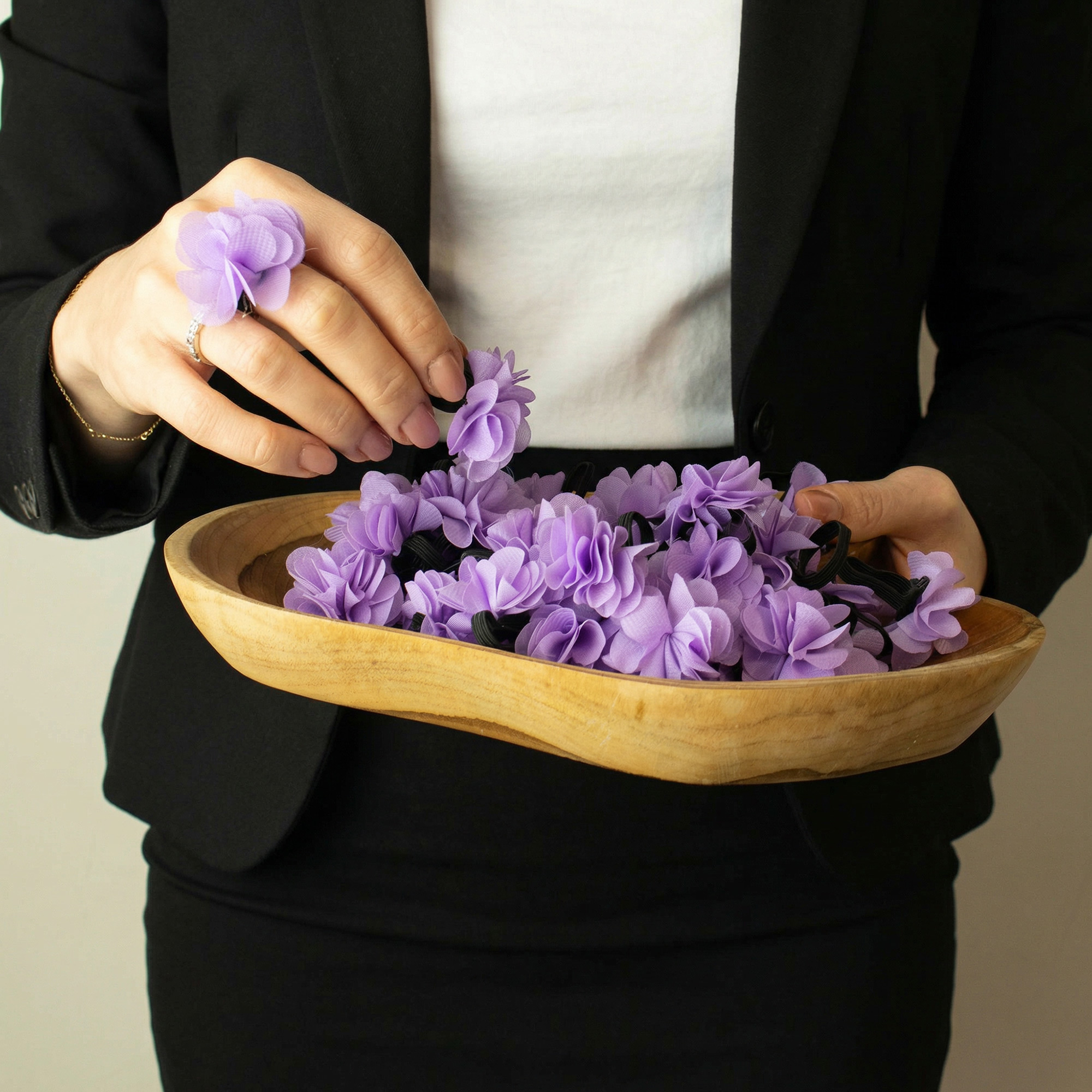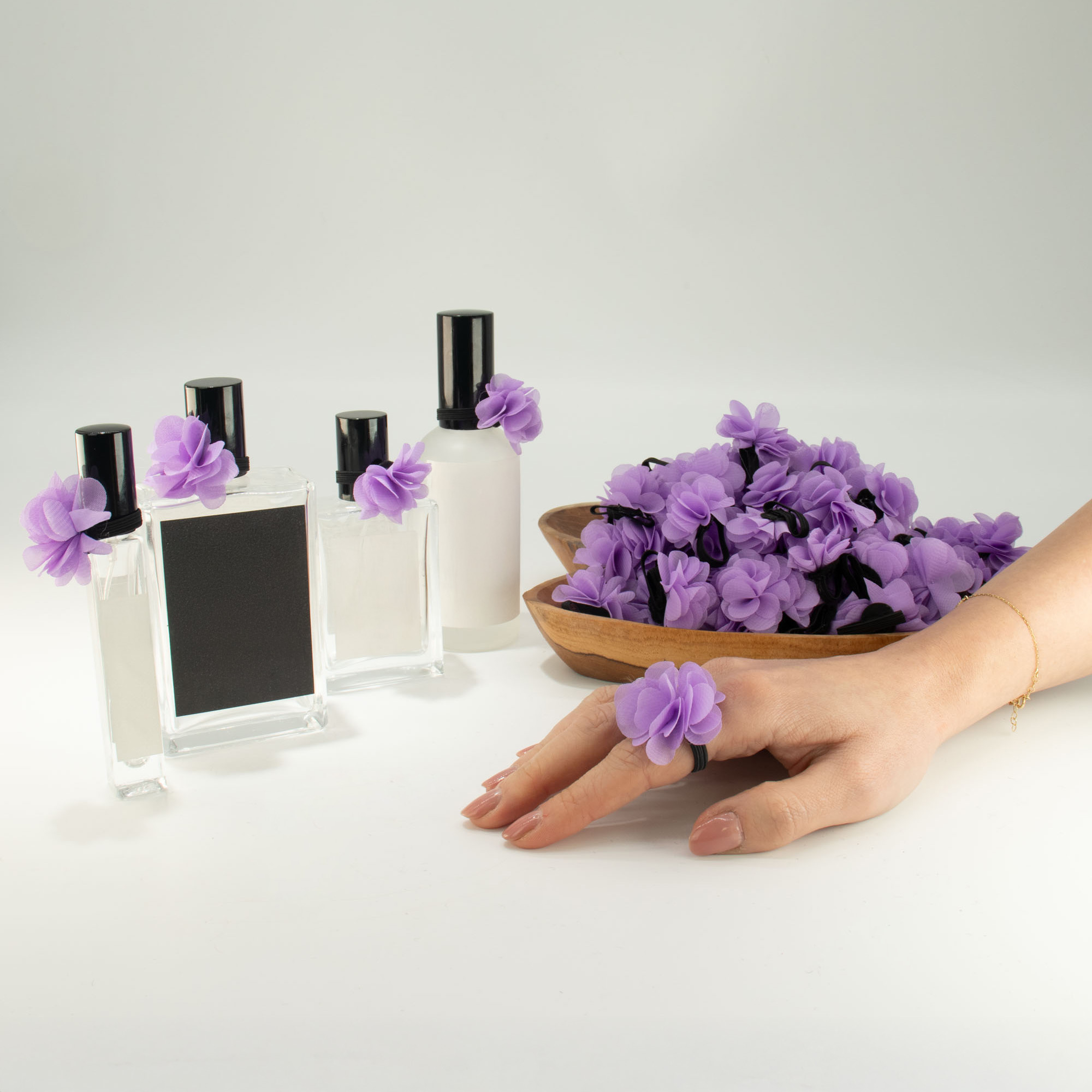 Gli anelli in chiffon per profumi - viola, in vendita all'ingrosso, offrono un modo creativo ed elegante per godersi una fragranza durante tutta la giornata. Caratterizzati da un morbido fiore in tessuto fissato a un comodo anello elastico, possono essere indossati come un elegante accessorio, rilasciando delicatamente il vostro profumo o olio profumato preferito.