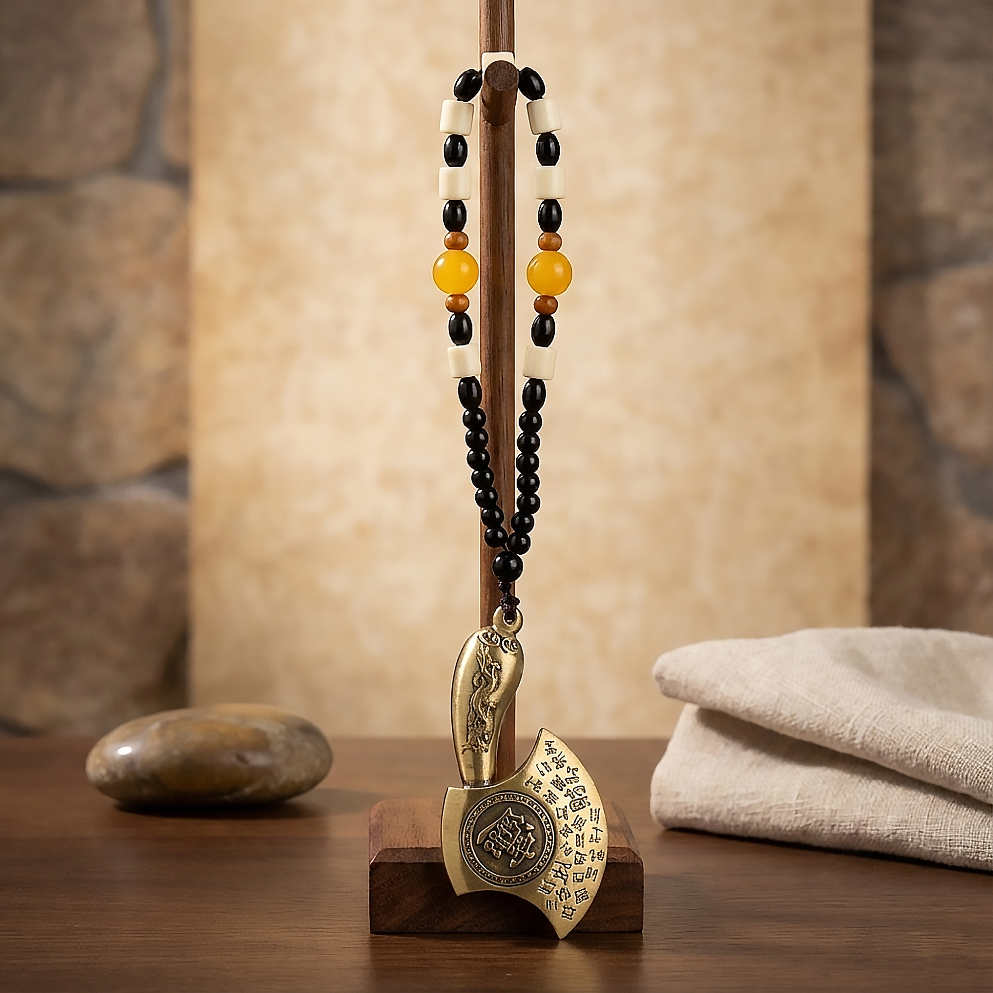 Questo pendente Feng Shui a forma di ascia si ispira a una tradizionale ascia cerimoniale, simbolo di autorità, protezione e tutela della ricchezza. Nella pratica del Feng Shui, l’ascia rappresenta il controllo delle risorse e la salvaguardia della prosperità, piuttosto che forza o conflitto. Il pezzo unisce significato simbolico e valore decorativo, rendendolo adatto sia a spazi spirituali sia ad ambienti curati dal punto di vista dell’interior design.