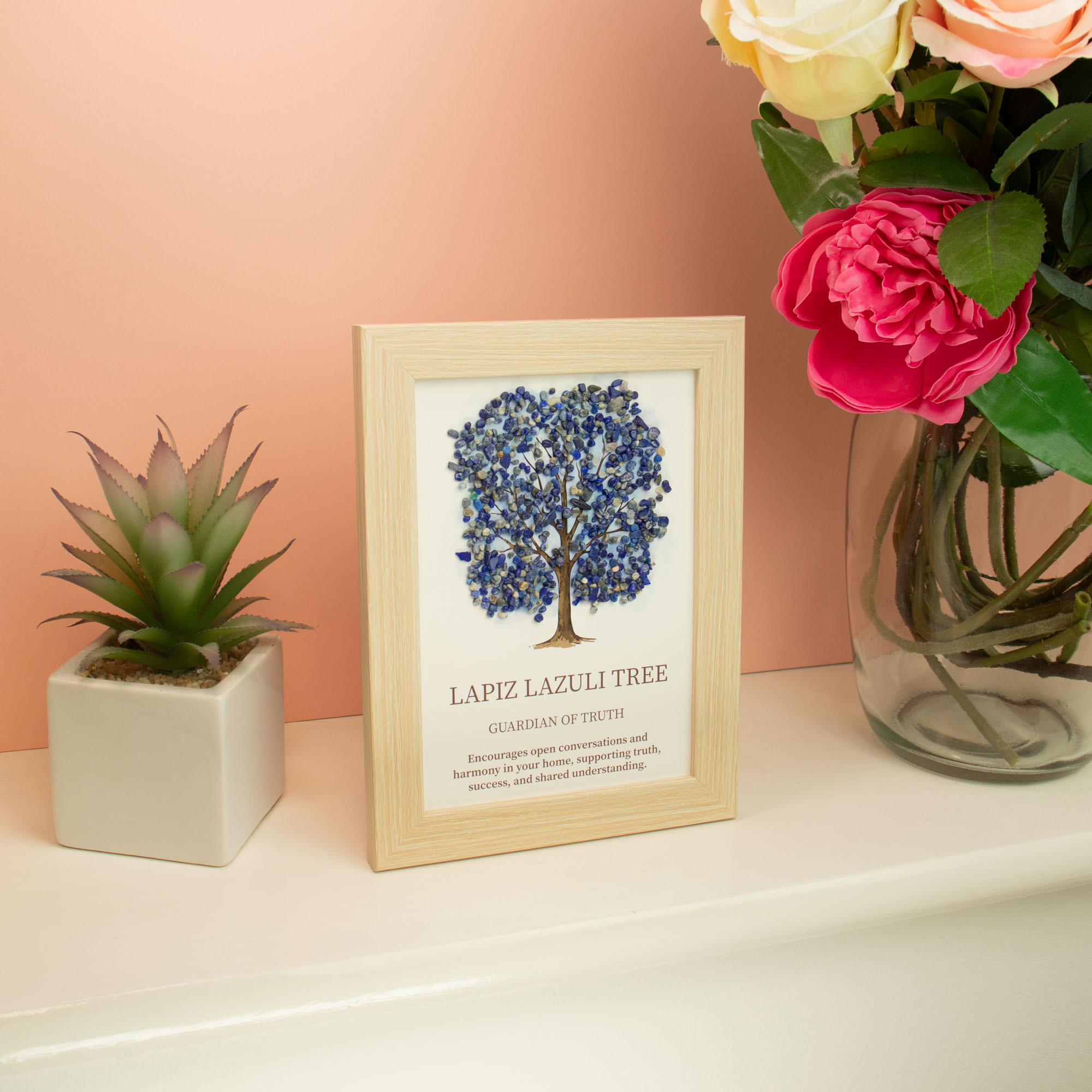 Il quadro con pietre semipreziose – Albero della Vita – Lapislazzuli, in vendita all'ingrosso, è concepito come simbolico “Guardiano della Verità”, progettato per portare chiarezza ed energia positiva sia negli ambienti domestici che lavorativi. La chioma dell’albero è composta da autentiche pietre di lapislazzuli blu intenso, accuratamente disposte per creare una superficie ricca e strutturata, con un elegante effetto tridimensionale sullo sfondo morbido dell’illustrazione.