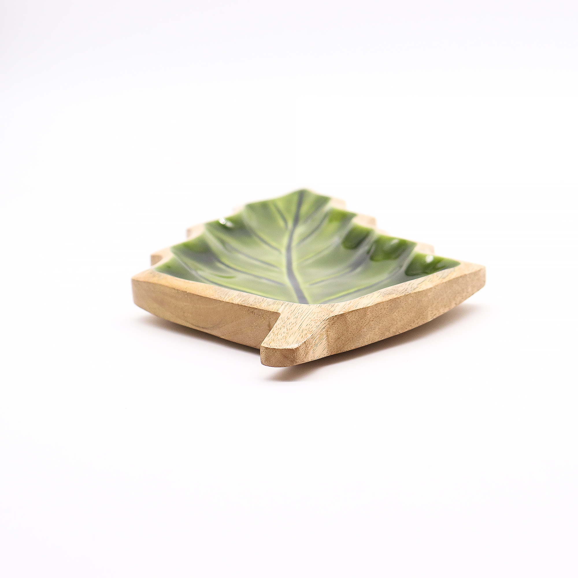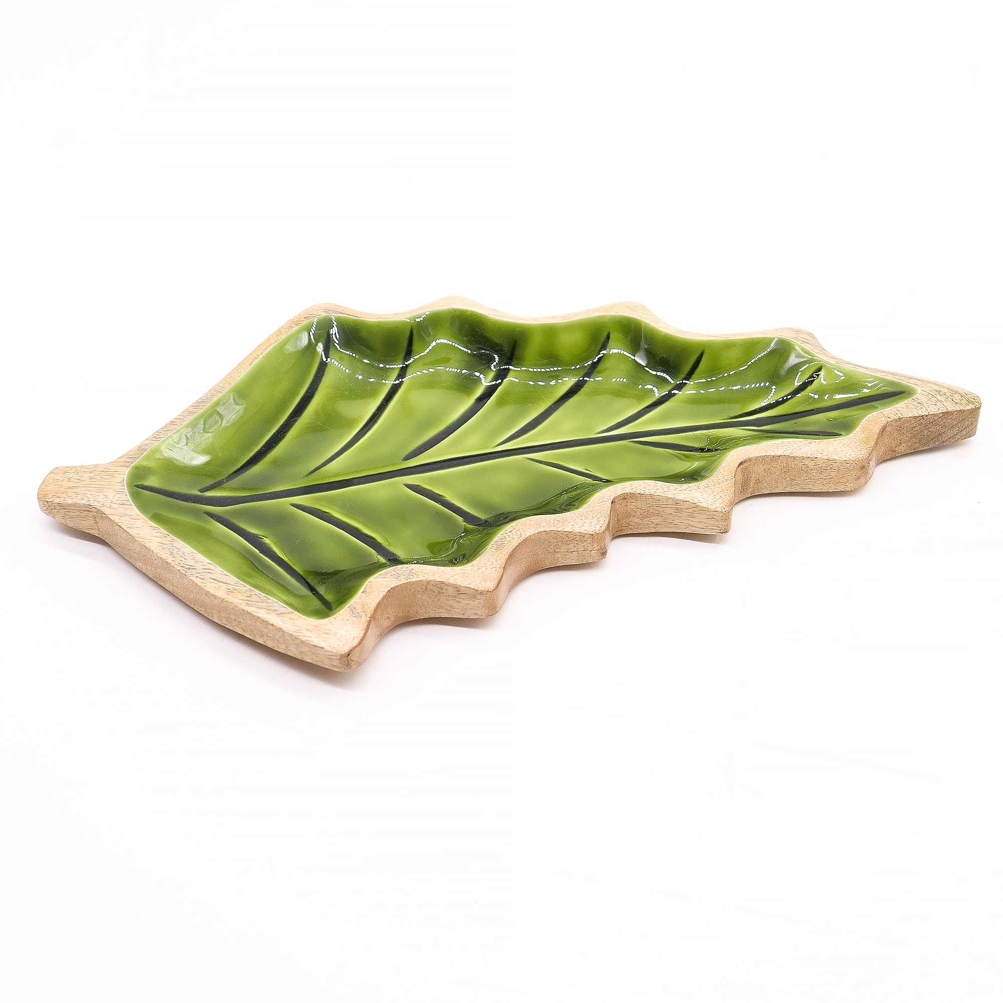 Intagliata a mano in India da artigiani esperti, è realizzata in legno di mango sostenibile e modellata con cura nella forma di una foglia elegante. L’interno è impreziosito da una finitura in smalto verde lucido, che crea un contrasto affascinante tra la texture rustica del legno e l’accento brillante e vivace.