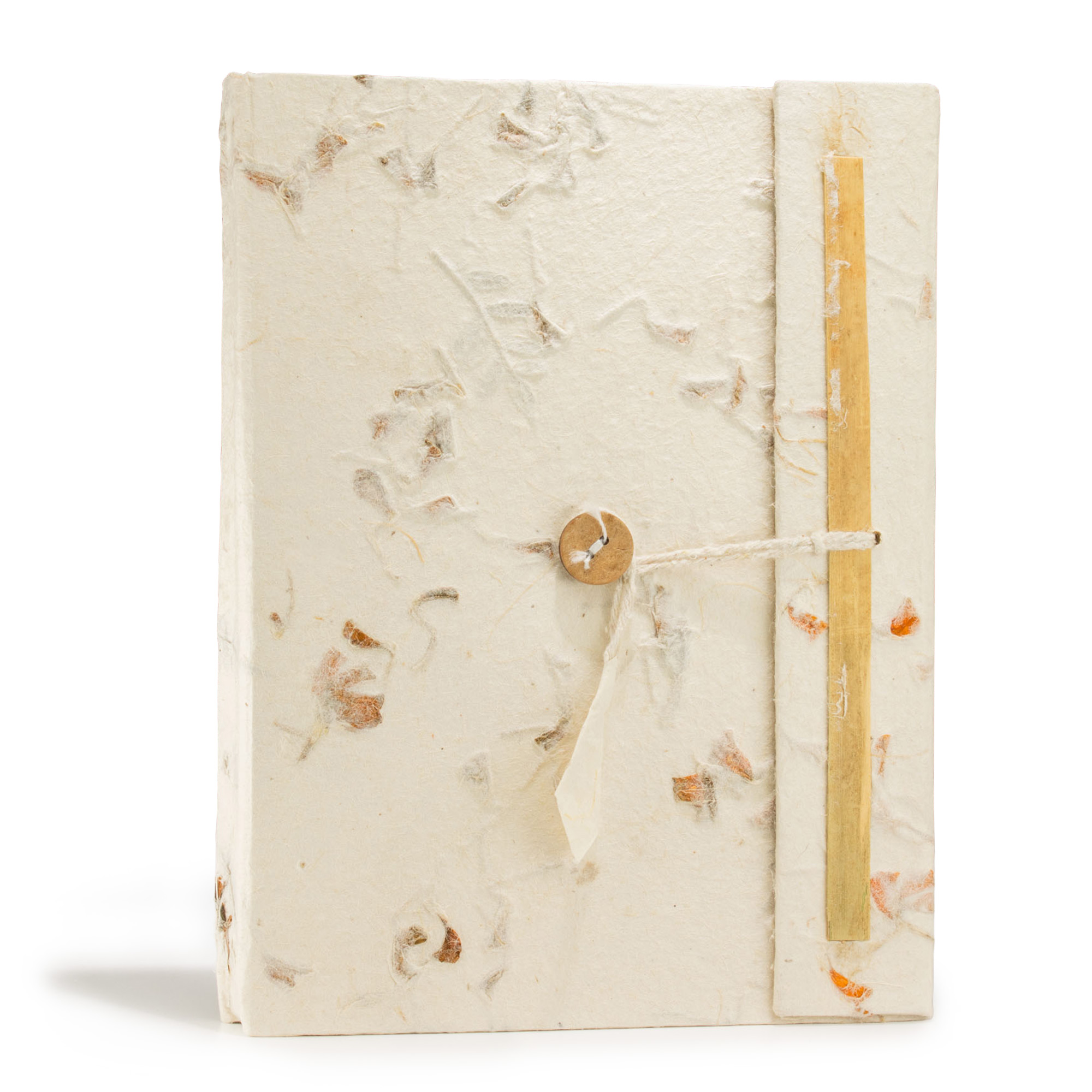 All’interno, 45 pagine bianche in carta Lokta offrono ampio spazio per scrivere o disegnare. Il taccuino include un segnalibro coordinato e una chiusura in tessuto, per un design completo e curato.