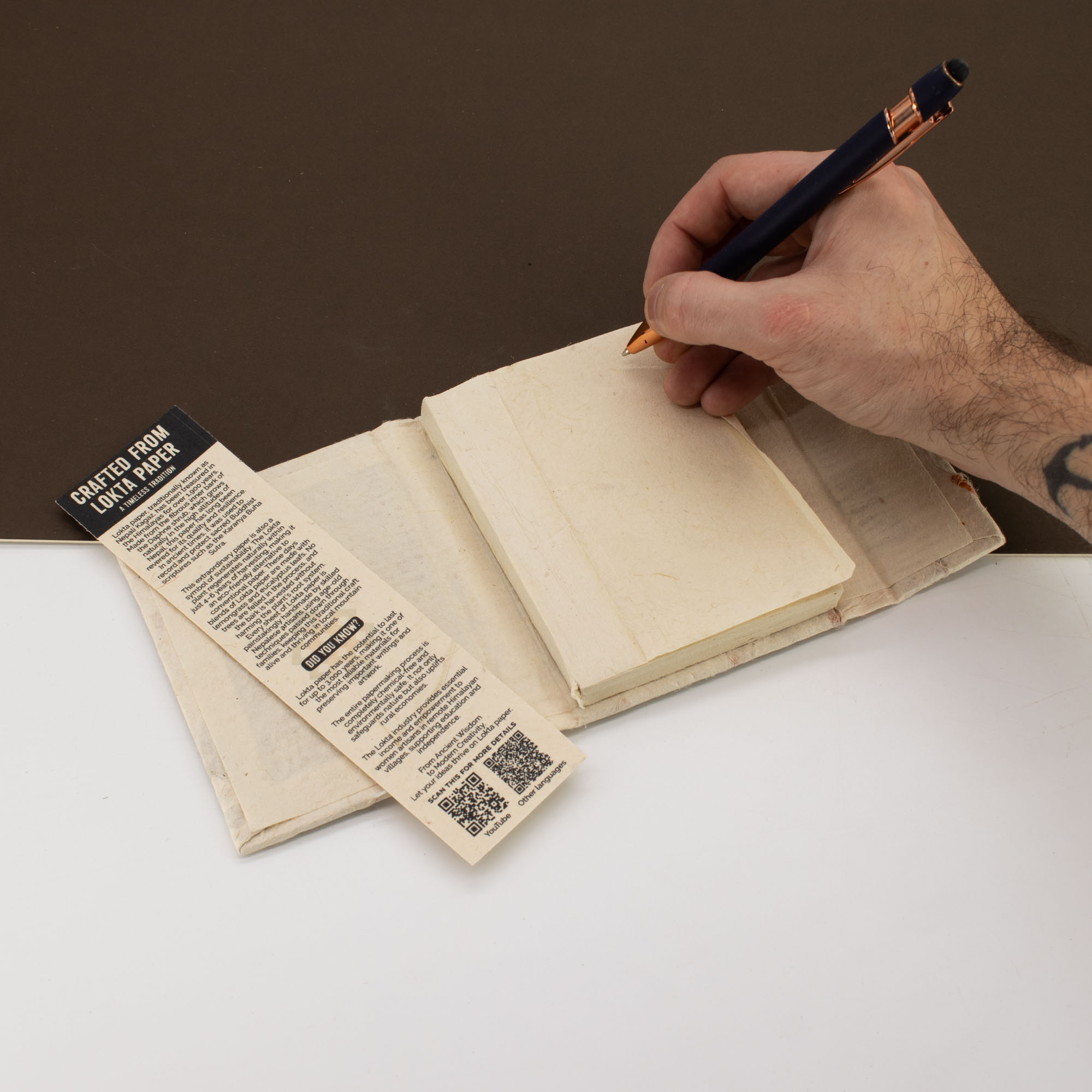 Il formato da 12x8 cm è perfetto per brevi appunti, liste o affermazioni quotidiane. Con 40 pagine in carta Lokta naturale, è leggero, piacevole al tatto e facile da portare con sé ovunque.