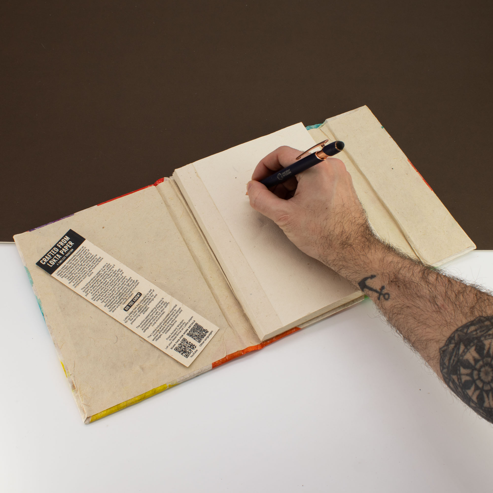 Questo taccuino grande è pieno di carattere e allegria, con una copertina realizzata in carta Lokta a strati dai colori brillanti e dinamici.