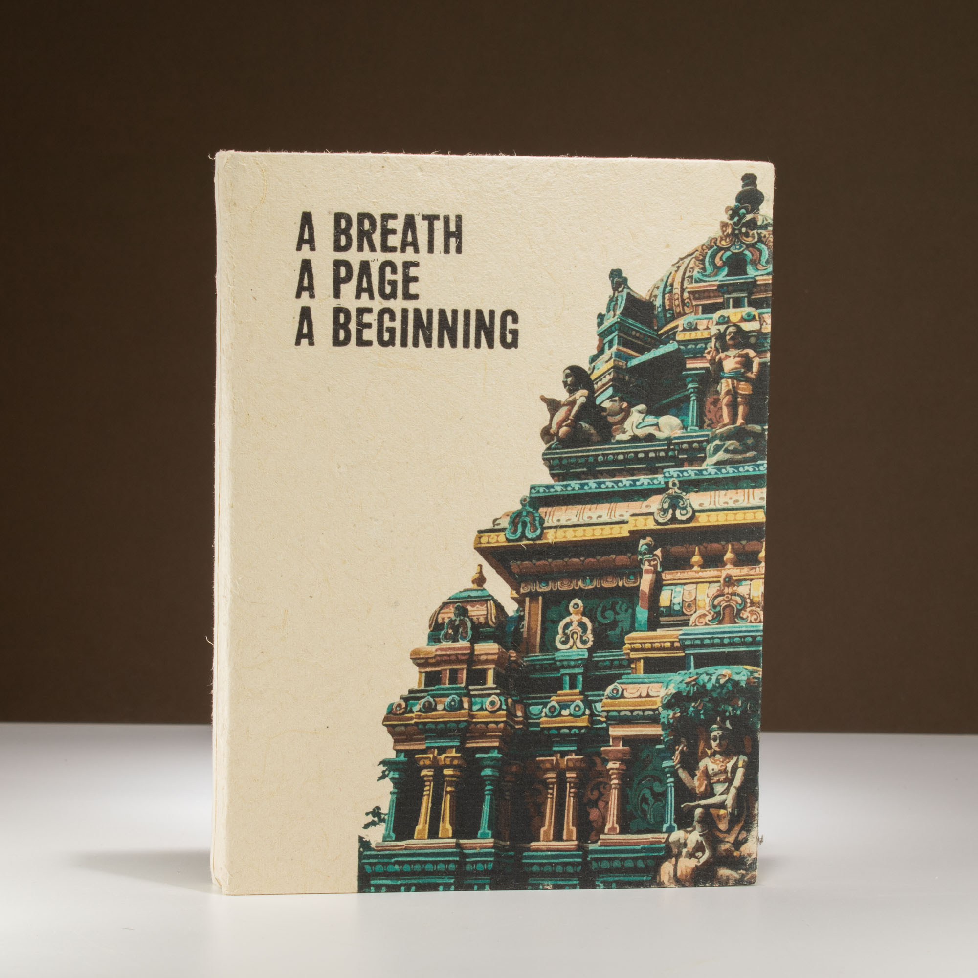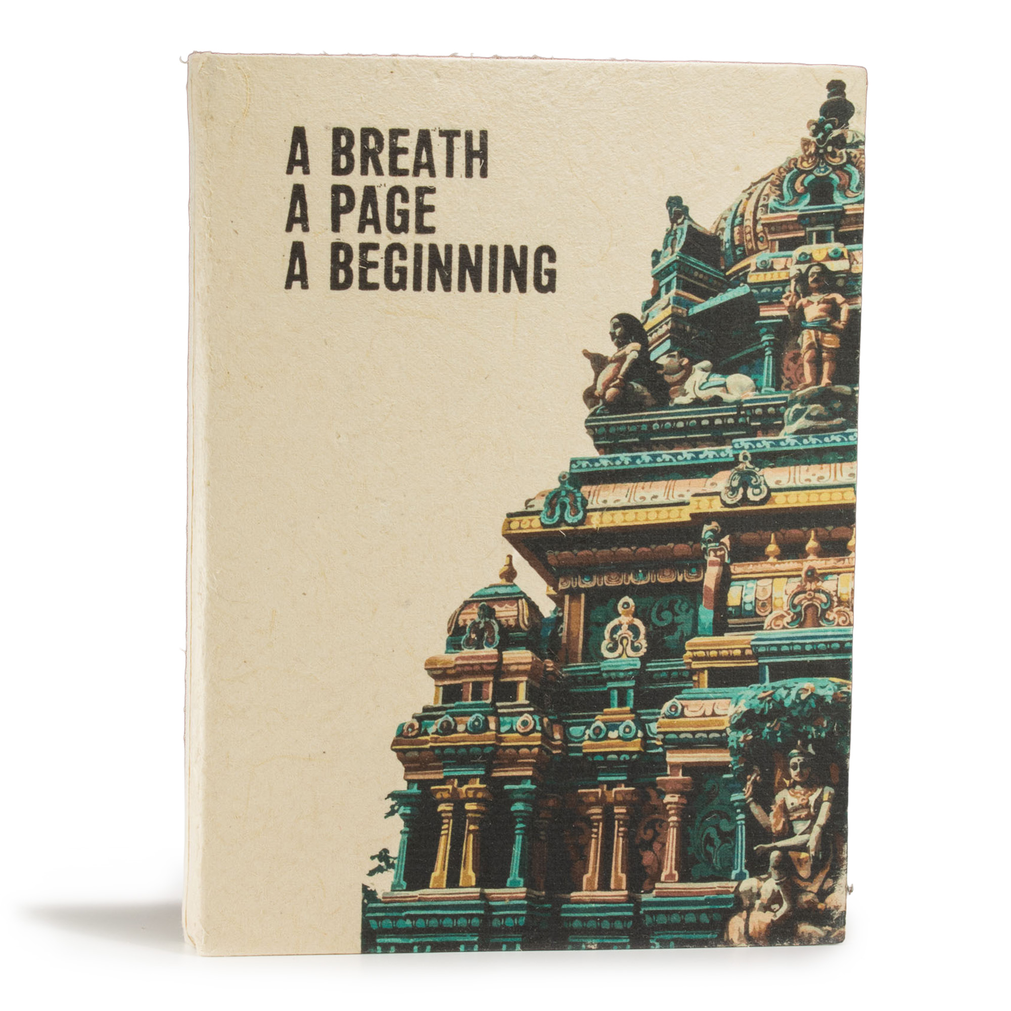 Calmo e poetico, questo taccuino presenta un delicato motivo architettonico a forma di tempio, accompagnato dalla frase “A Breath, A Page, A Beginning” – un invito alla concentrazione silenziosa e al rinnovamento personale.