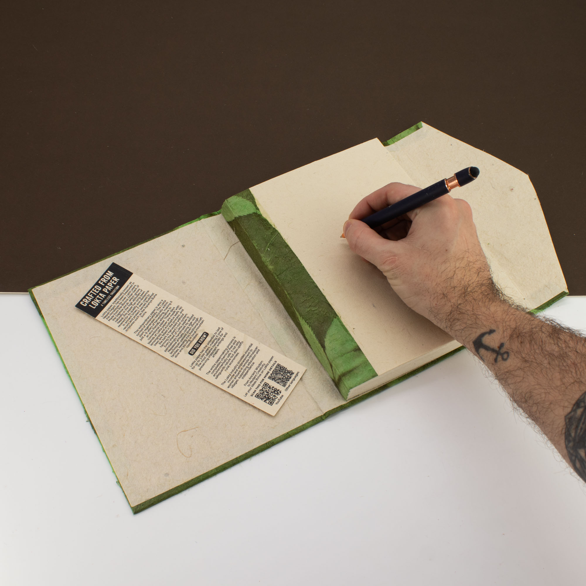 Questo taccuino grande in carta Lokta floreale verde, in vendita all'ingrosso, unisce la tradizionale lavorazione della carta himalayana a un meraviglioso design floreale, creando un pezzo immediatamente riconoscibile come speciale. Realizzato a mano in Nepal con carta Lokta proveniente da fonti sostenibili, ogni taccuino offre sottili variazioni e una qualità tattile che i prodotti industriali non possono replicare.