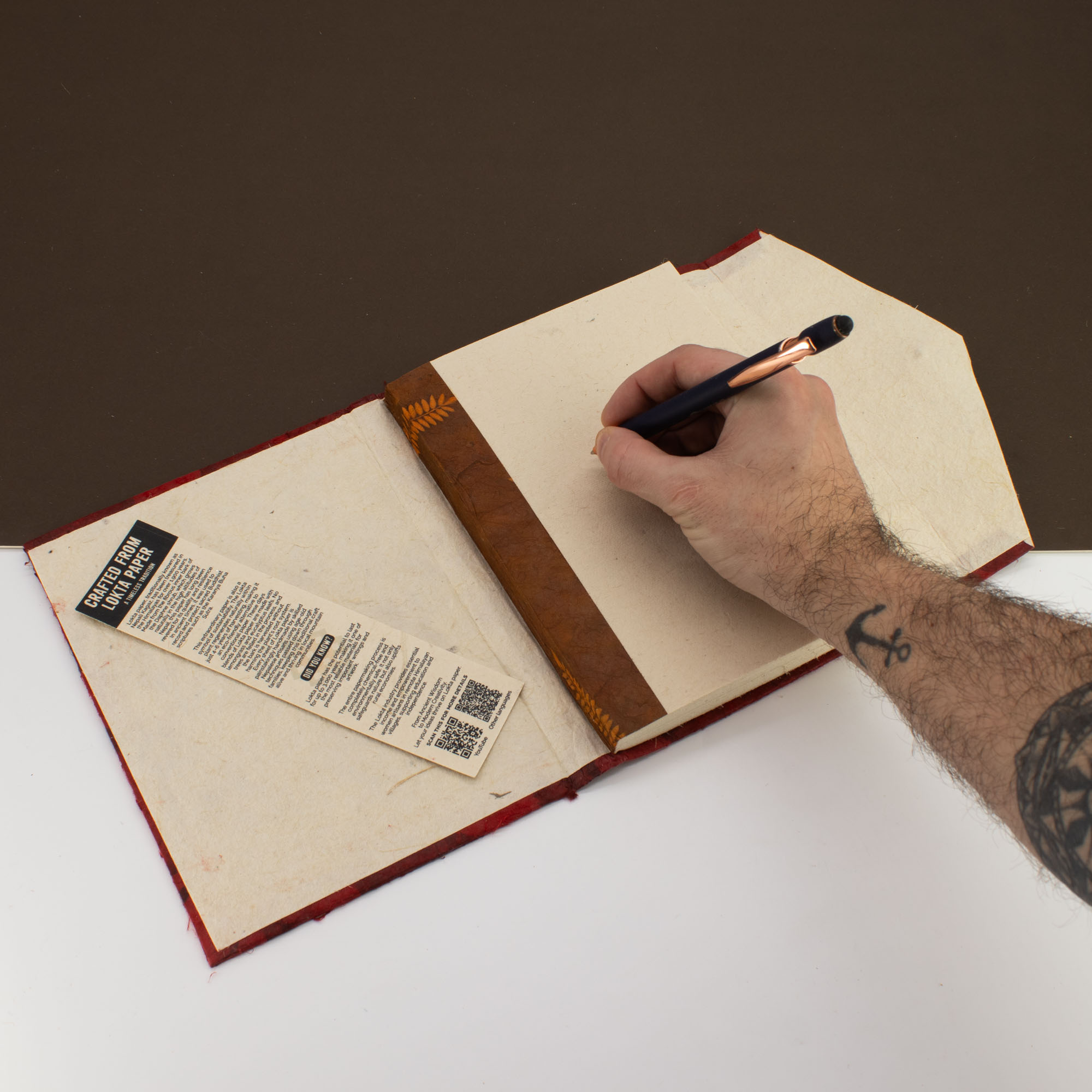 Questo taccuino grande in carta Lokta floreale rosso, in vendita all'ingrosso, unisce la tradizionale lavorazione della carta himalayana a un meraviglioso design floreale, creando un pezzo immediatamente riconoscibile come speciale. Realizzato a mano in Nepal con carta Lokta proveniente da fonti sostenibili, ogni taccuino offre sottili variazioni e una qualità tattile che i prodotti industriali non possono replicare.