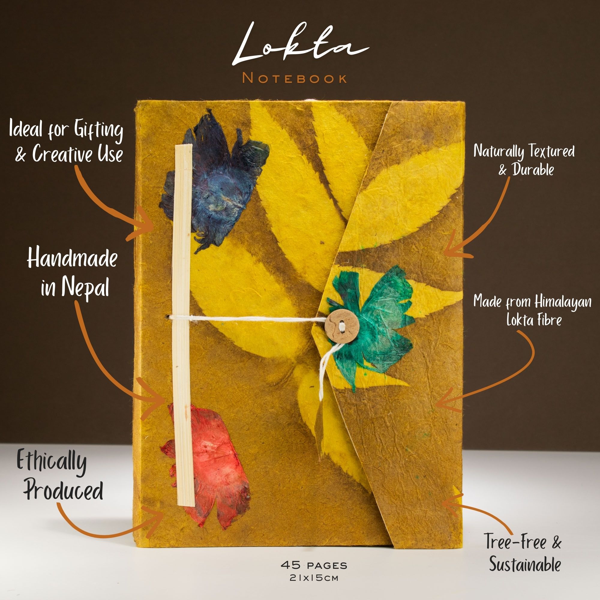 Questo taccuino grande in carta Lokta floreale senape, in vendita all'ingrosso, unisce la tradizionale lavorazione della carta himalayana a un meraviglioso design floreale, creando un pezzo immediatamente riconoscibile come speciale. Realizzato a mano in Nepal con carta Lokta proveniente da fonti sostenibili, ogni taccuino offre sottili variazioni e una qualità tattile che i prodotti industriali non possono replicare.