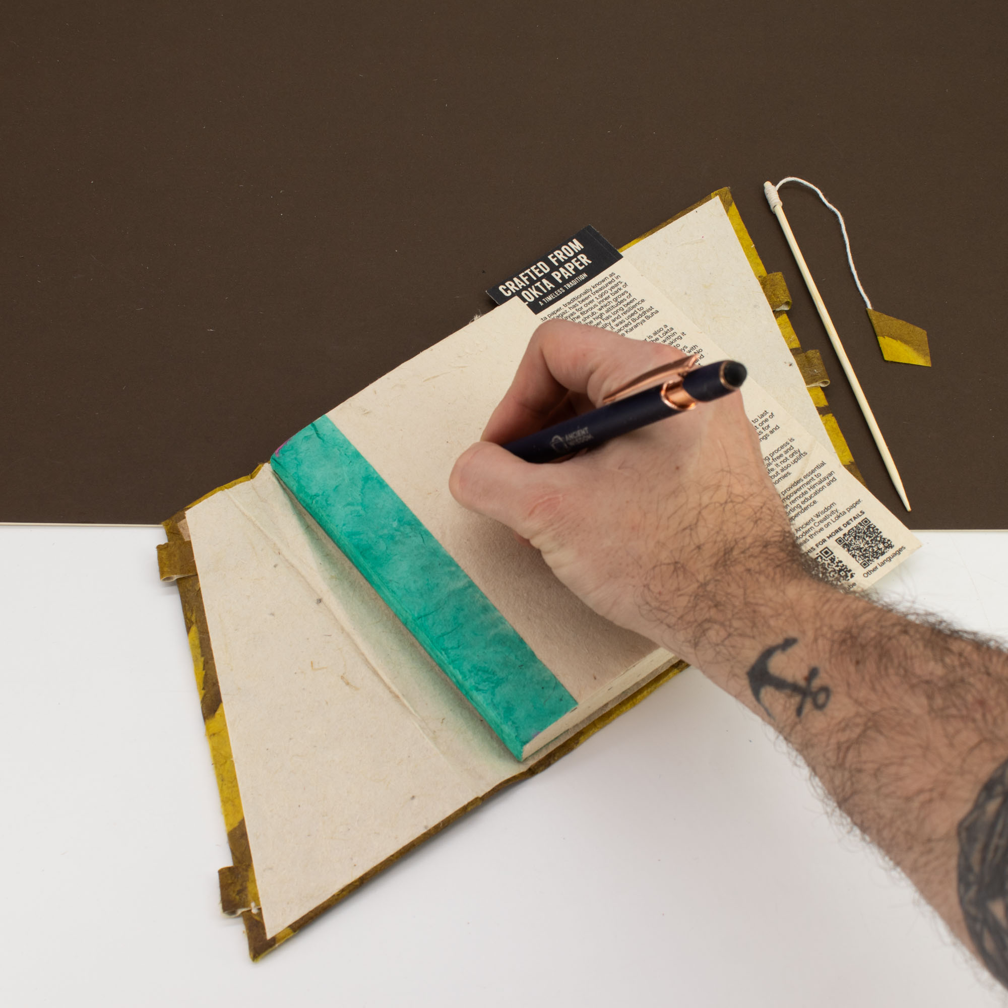 All’interno, 45 pagine fatte a mano con tradizionale carta Lokta offrono una consistenza unica, ricca di carattere artigianale, che le produzioni industriali non possono replicare. Leggero, pratico e dal design distintivo, è la scelta ideale sia come regalo elegante sia come accessorio di cancelleria essenziale per la vita di tutti i giorni.