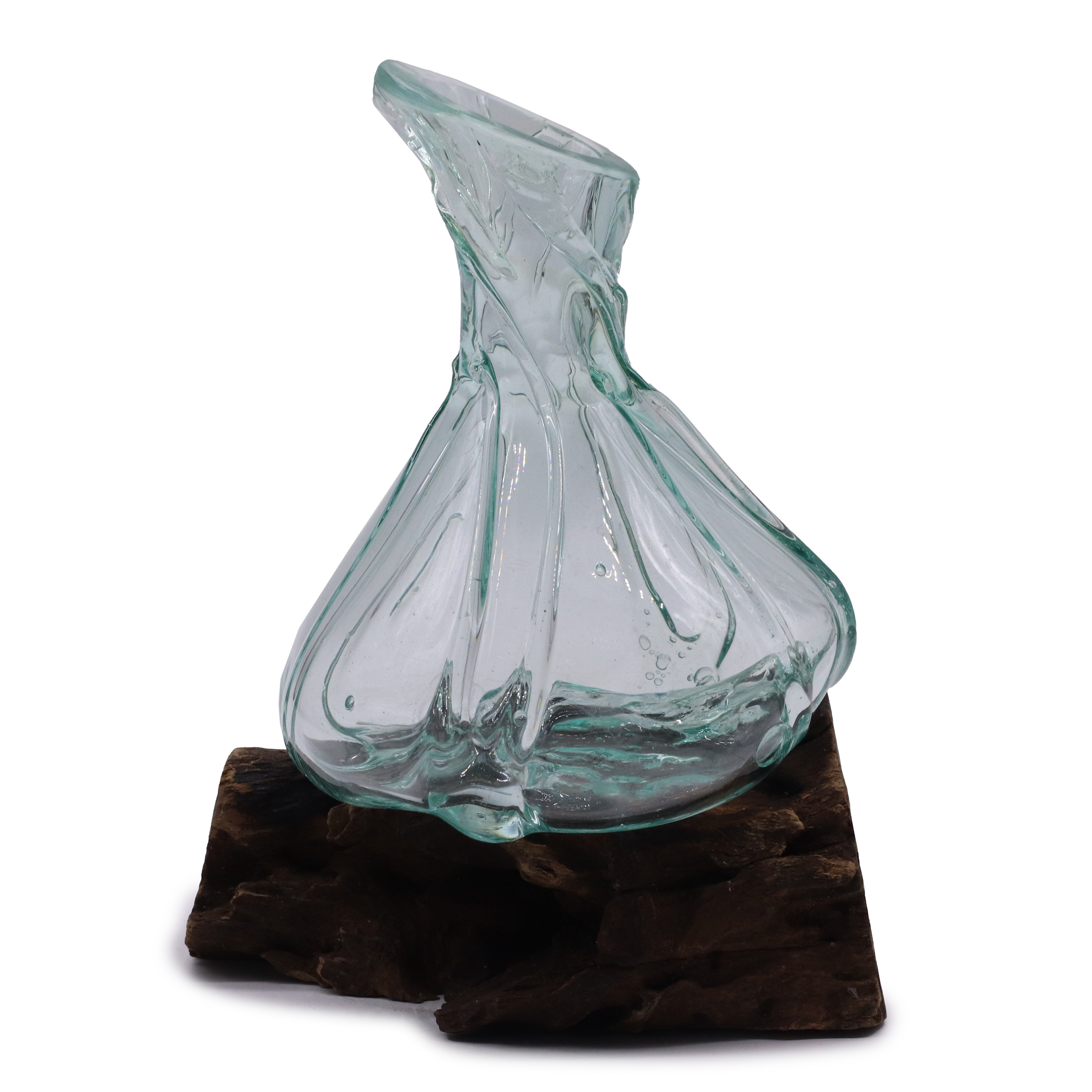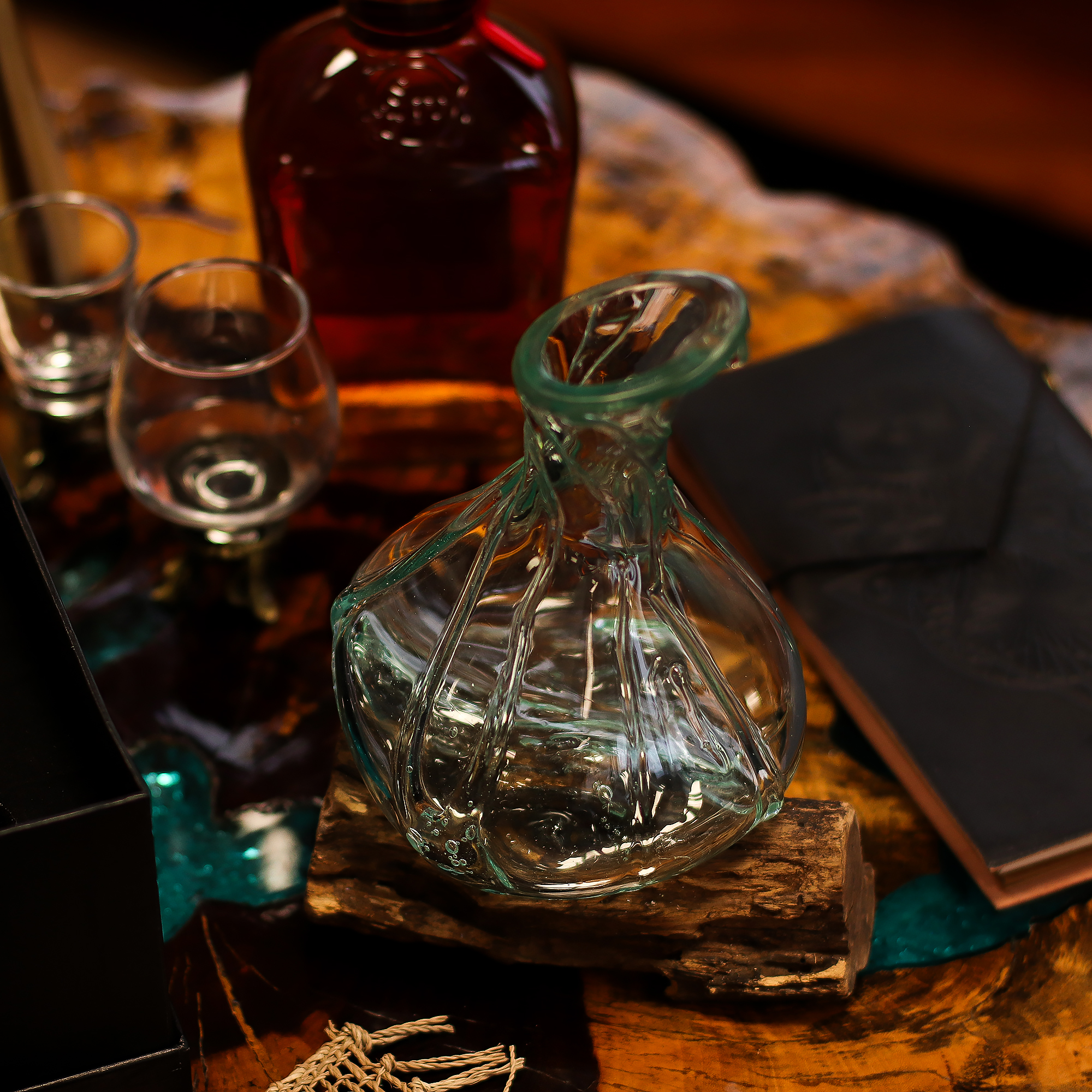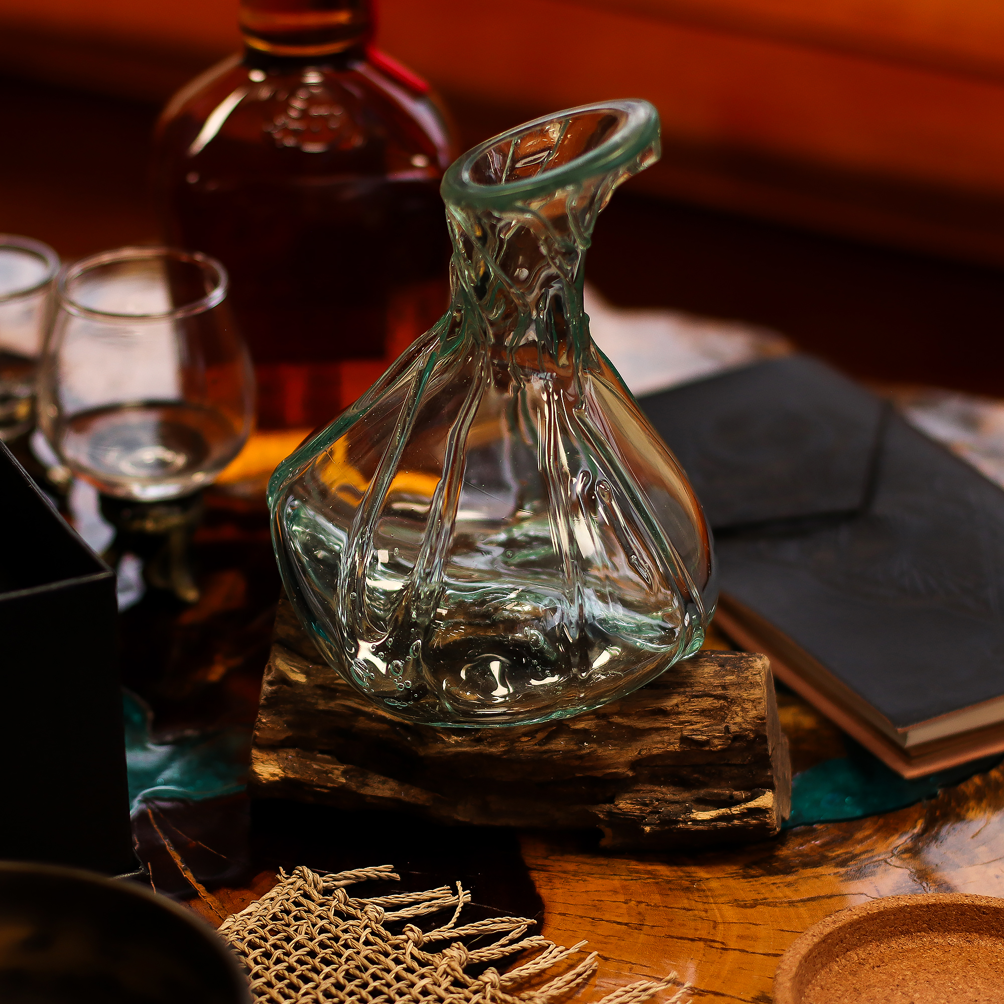 Ogni pezzo è soffiato a mano con vetro riciclato e si adagia armoniosamente su una base in legno naturale, modellata dal calore del vetro per garantire un incastro perfetto. La silhouette elegante e la texture organica lo rendono ideale come decanter per vino o acqua, oppure come raffinato elemento decorativo.