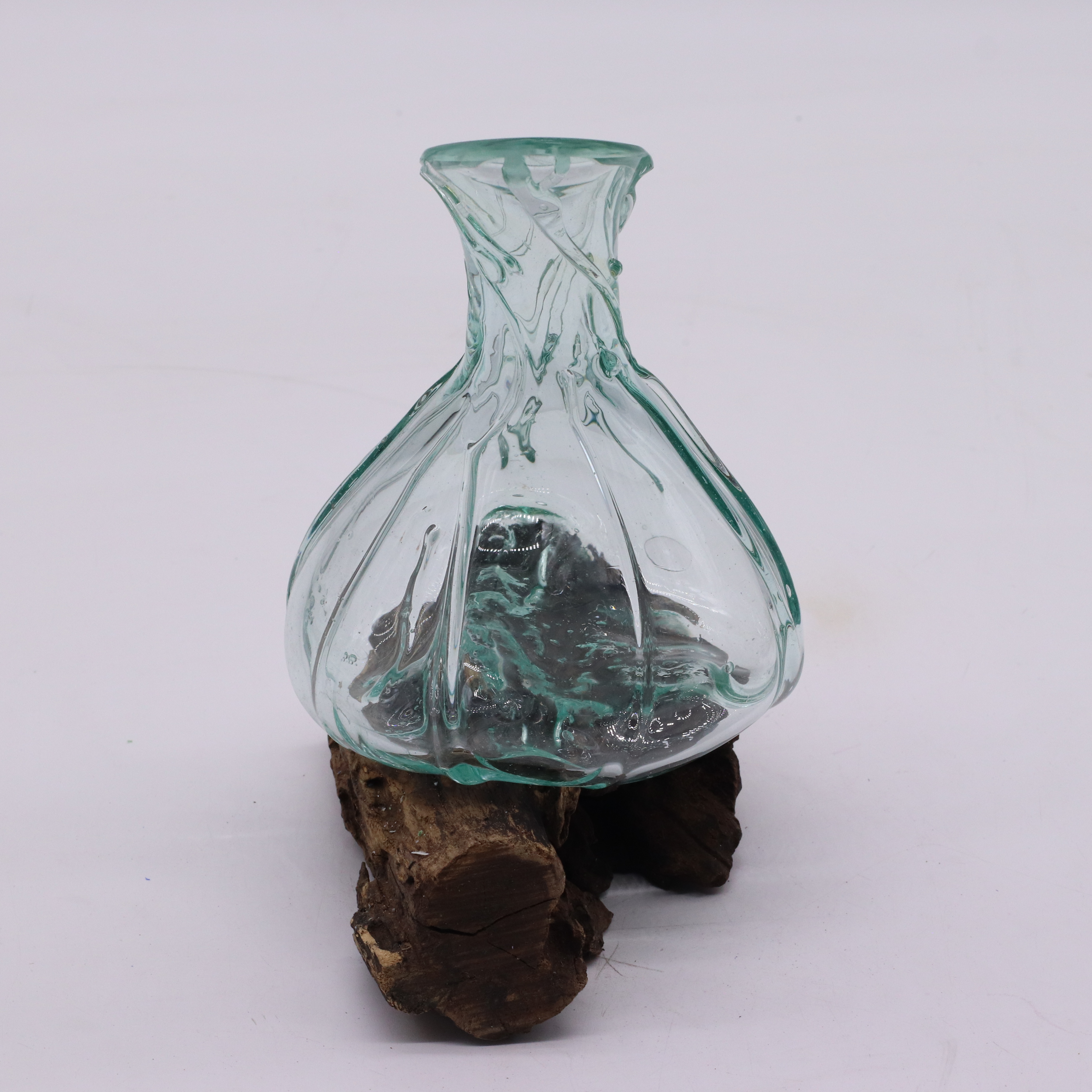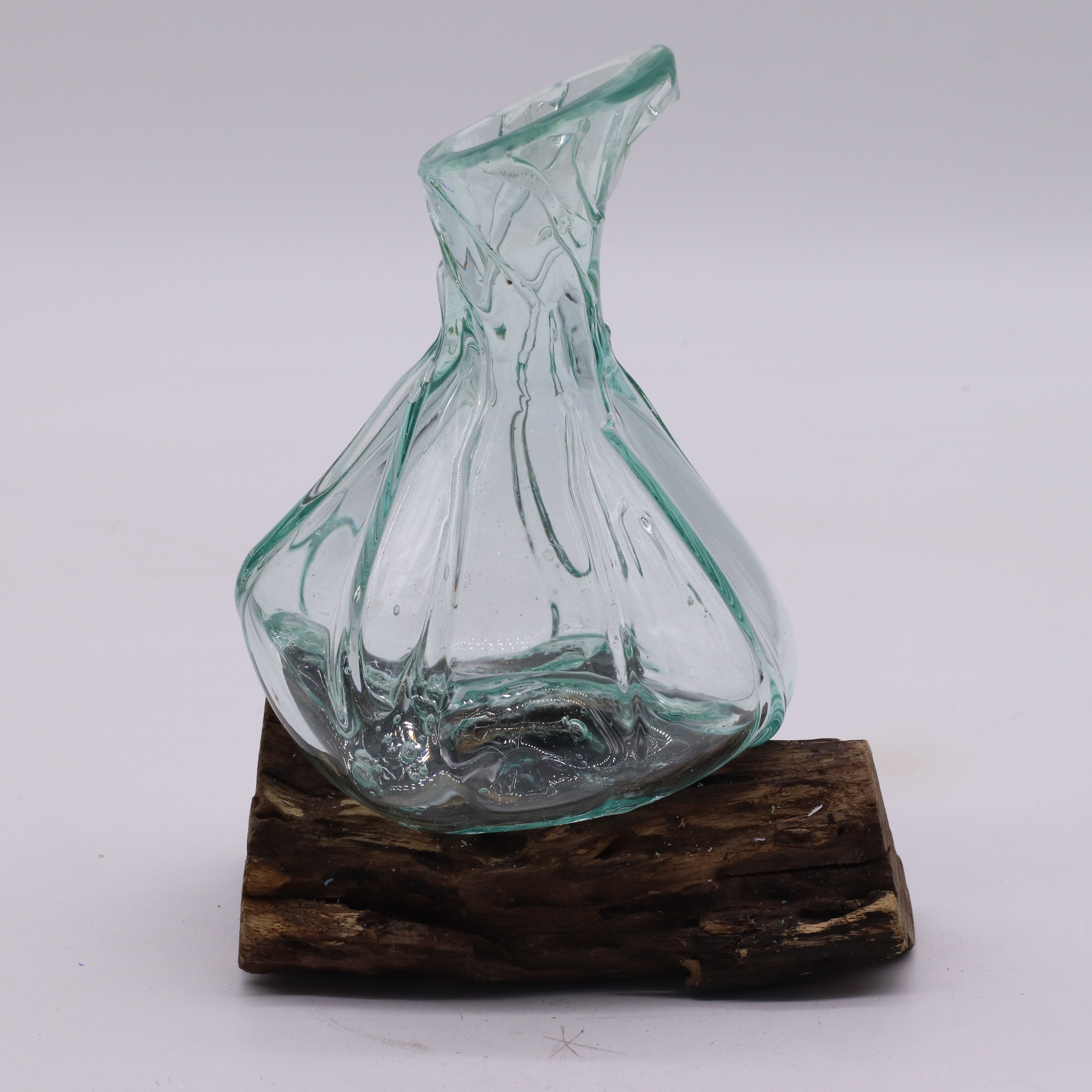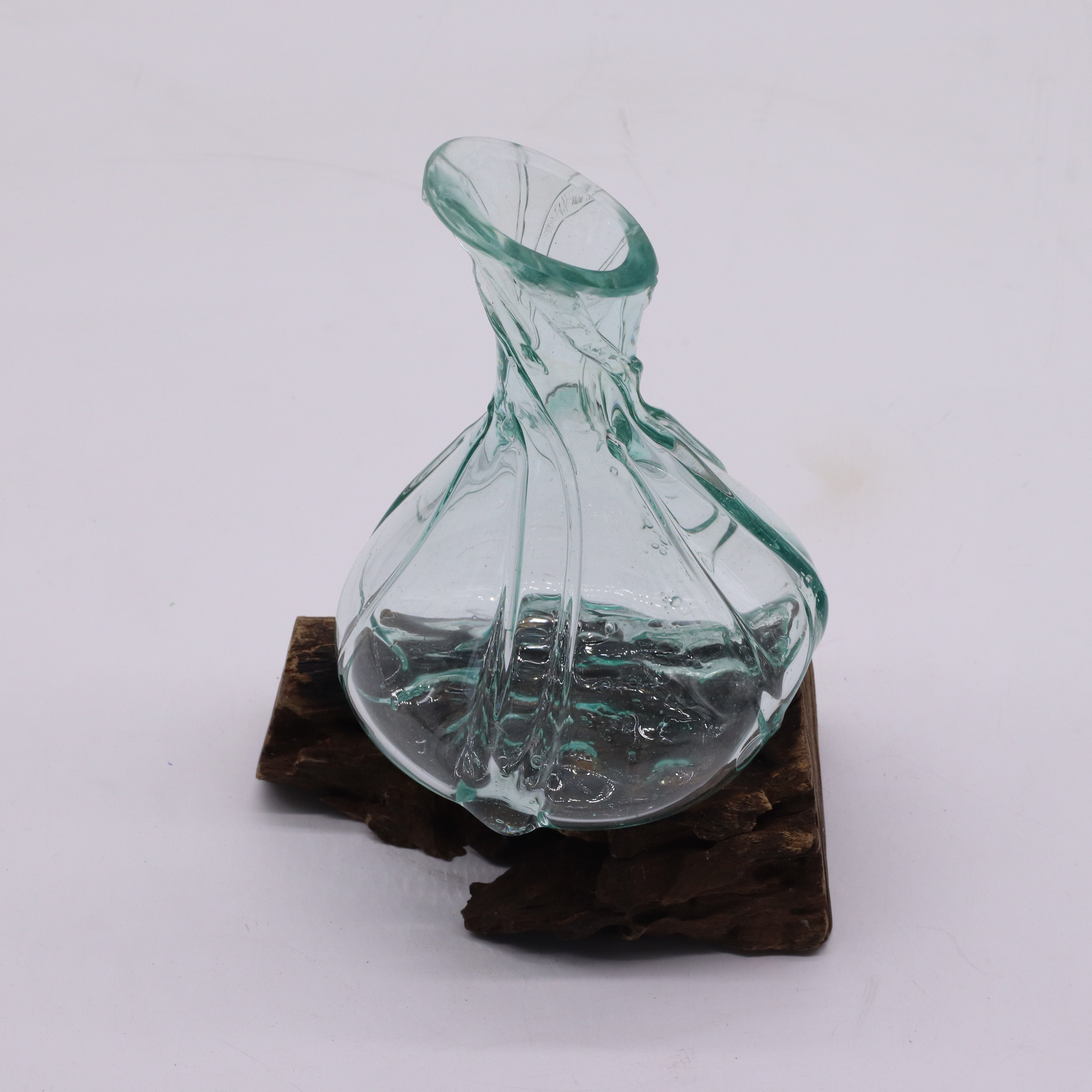 Ogni pezzo è soffiato a mano con vetro riciclato e si adagia armoniosamente su una base in legno naturale, modellata dal calore del vetro per garantire un incastro perfetto. La silhouette elegante e la texture organica lo rendono ideale come decanter per vino o acqua, oppure come raffinato elemento decorativo.