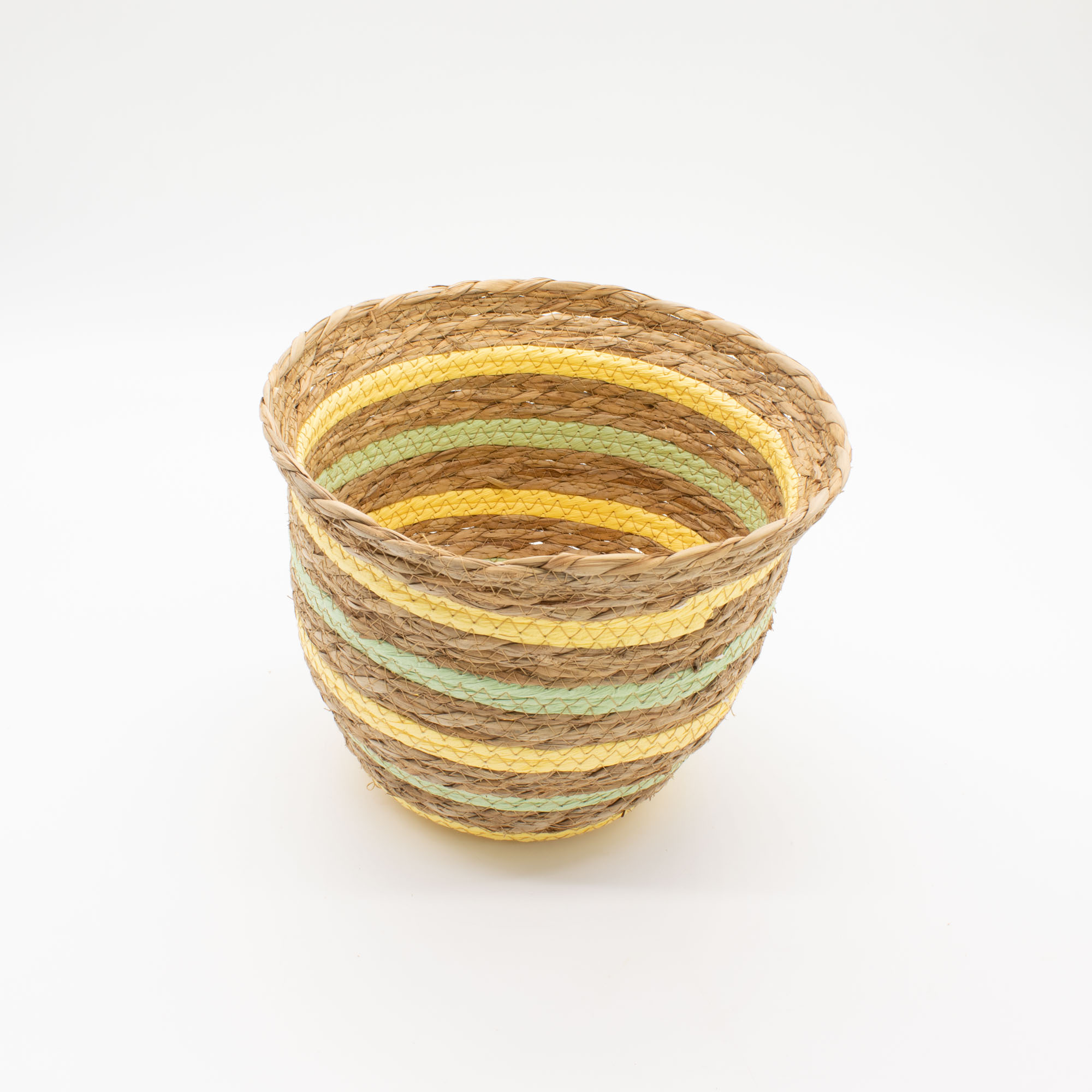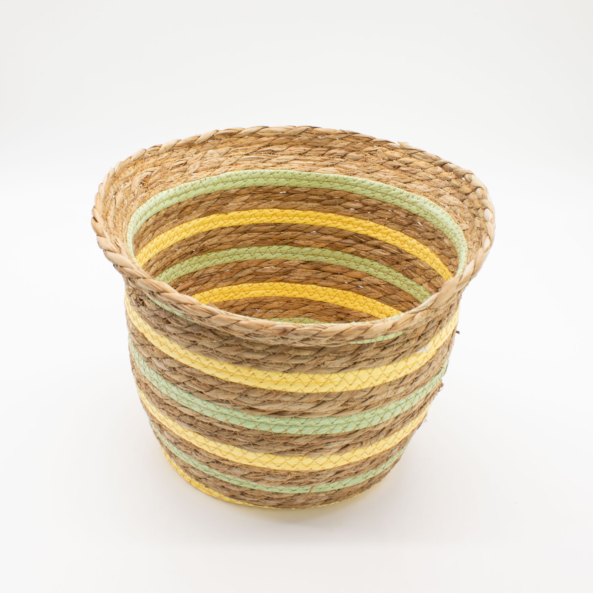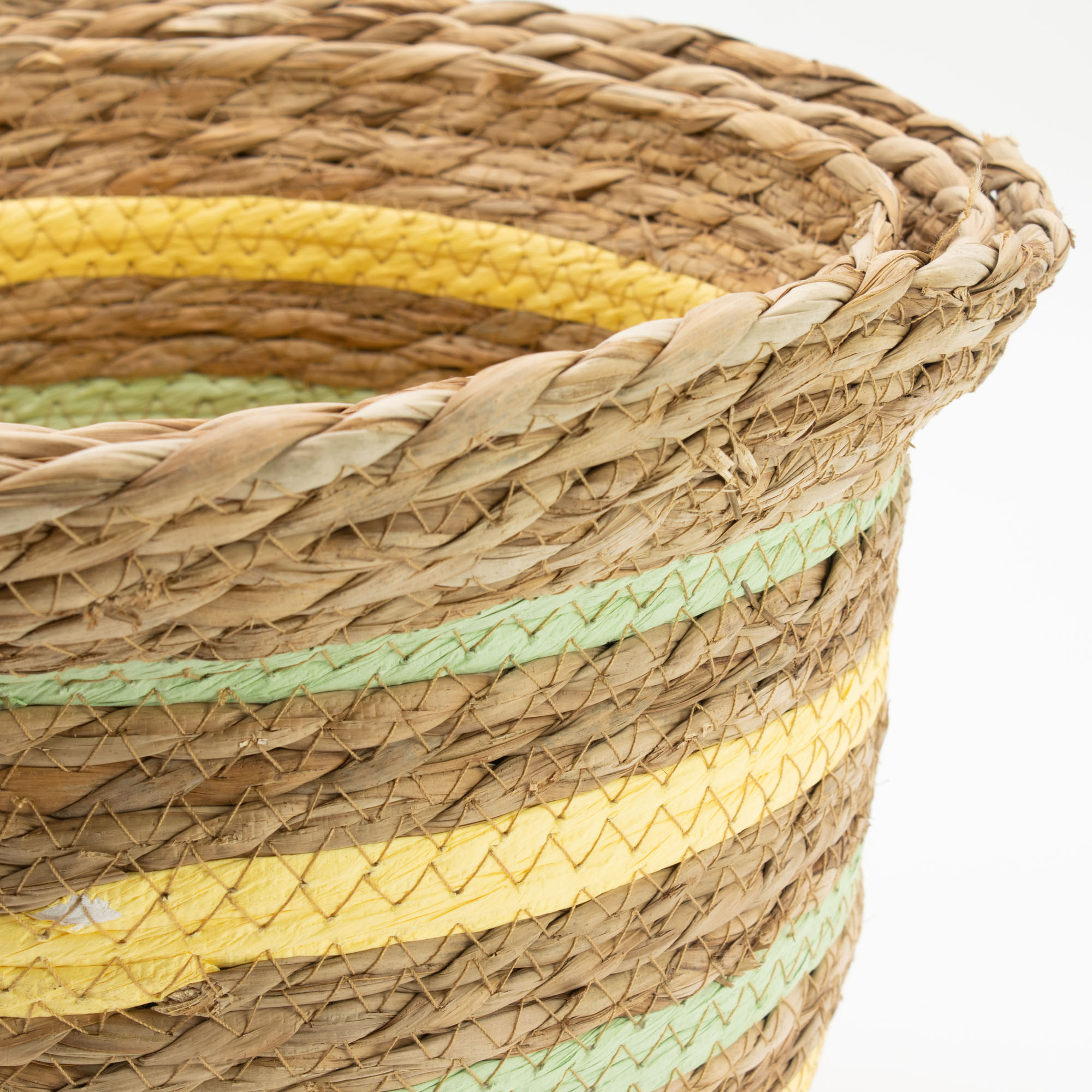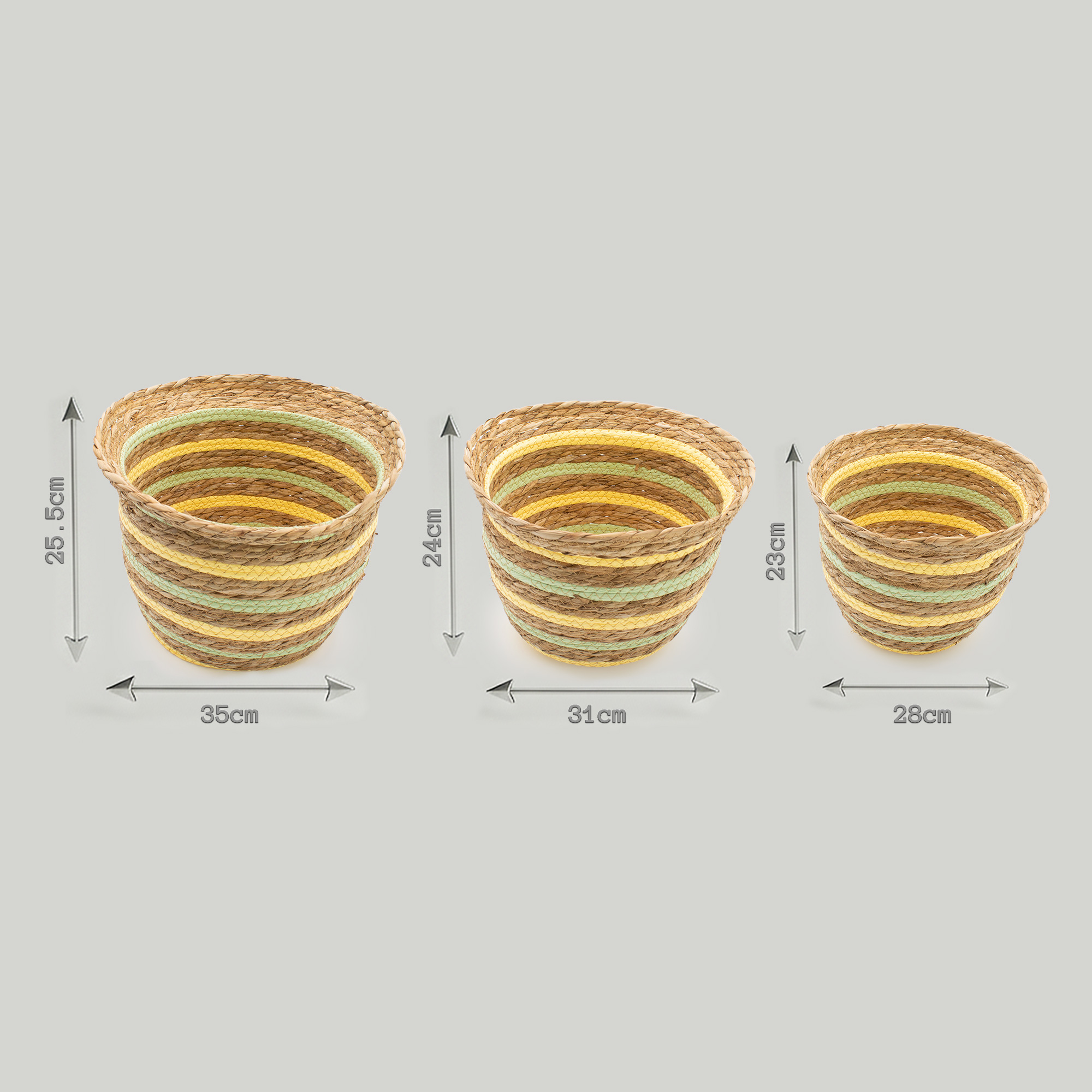 Set 3 Cestini – Cestini Rotondi con Coperchio in Cotone e Alghe Marine - Naturale, in vendita all'ingrosso. Realizzati in paglia e alghe marine intrecciate secondo una tradizionale tecnica di avvolgimento che conferisce loro robustezza e struttura. La forma arrotondata a forma di vaso è completata da delicati dettagli a righe gialle e verdi, che conferiscono ai cestini un carattere caldo e naturale, pur mantenendo la loro versatilità. Sono adatti per contenere tessuti, vasi, accessori o articoli per la casa di uso quotidiano.