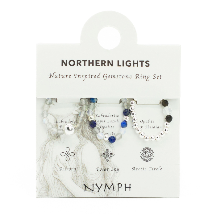 Il set “Aurora Boreale" della collezione Nymph, in vendita all’ingrosso, cattura i colori e il movimento dell’aurora boreale con un sorprendente mix di lapislazzuli, labradorite, opalite, fluorite e ossidiana nera. Il risultato è un set dinamico, dai toni cangianti e con una forte profondità visiva.