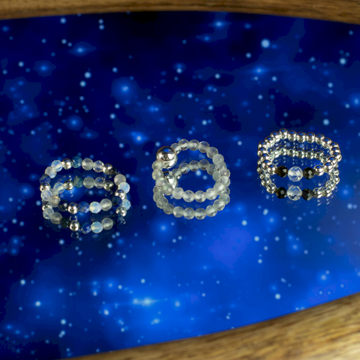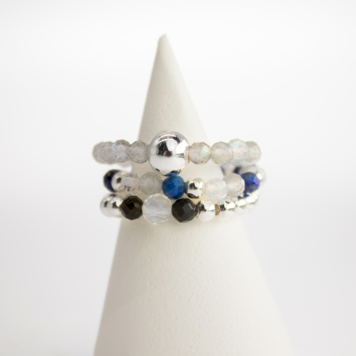 Ogni anello trasmette un’atmosfera unica: dal blu intenso del lapislazzuli al bagliore iridescente di labradorite e opalite. Indossati insieme, creano un look espressivo e ricercato; singolarmente, aggiungono accenti discreti ma distintivi.
