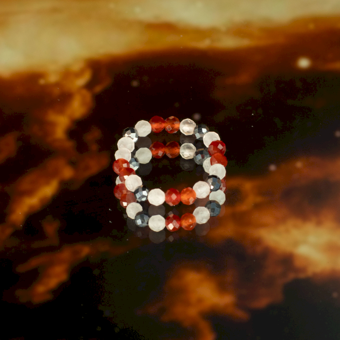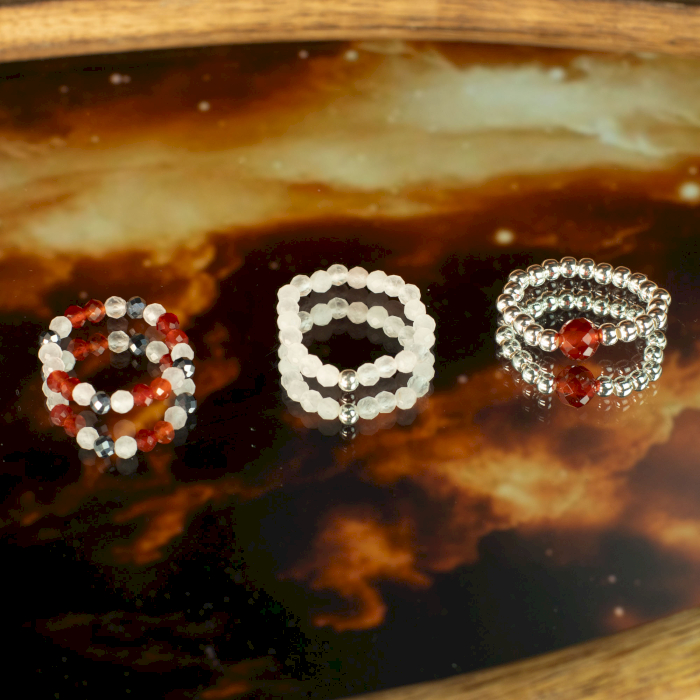 Indossati insieme, gli anelli creano un look coerente e armonioso, esprimendo connessione, devozione ed energia duratura. L’equilibrio tra toni cipria e rossi intensi conferisce un aspetto romantico senza risultare pesante, perfetto sia per l’uso quotidiano sia come regalo speciale.
