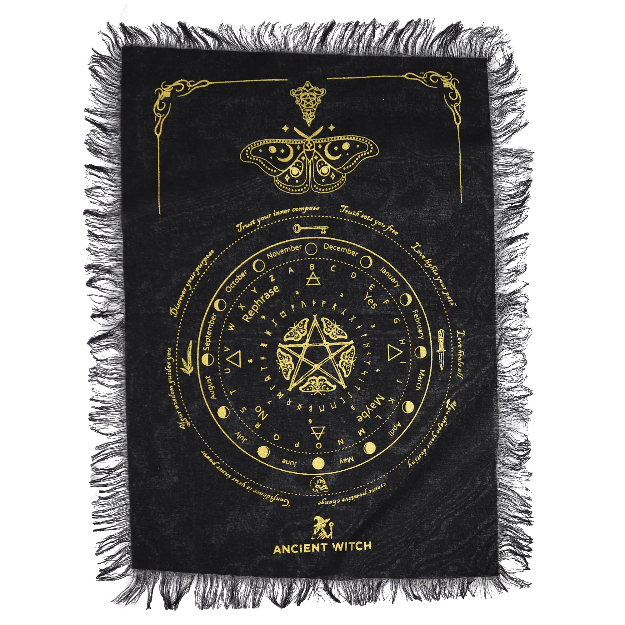 Realizzato in cotone e rifinito con frange decorative, definisce uno spazio rituale dedicato pur restando leggero e facile da piegare. Ideale per valorizzare l’esposizione in negozio o come proposta complementare a pendoli e strumenti divinatori.