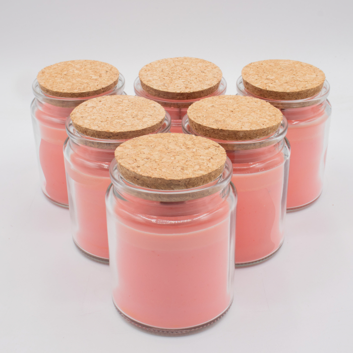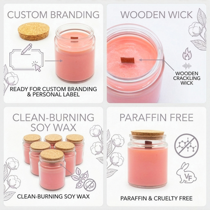 Introduci un'intramontabile fragranza di lavanda nella tua gamma di prodotti con la candela di soia con stoppino in legno "rosa di mezzanotte", in vendita all'ingrosso. Questa candela è disponibile in un formato senza etichetta, pronta per essere personalizzata, ideale per progetti di private label o concept di vendita al dettaglio personalizzati. La delicata tonalità lavanda della cera si abbina splendidamente al vasetto in vetro trasparente e al coperchio in sughero naturale, creando una presentazione semplice ed elegante che si adatta a diversi stili di branding.