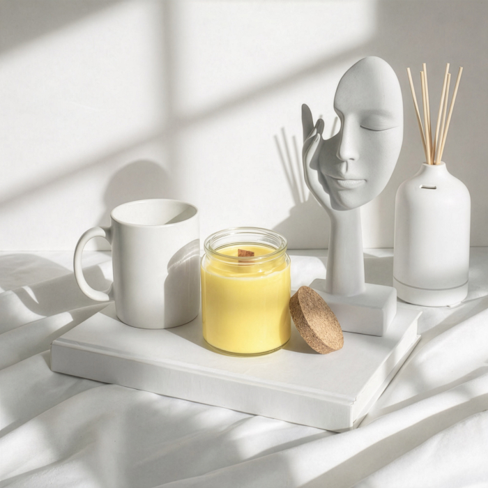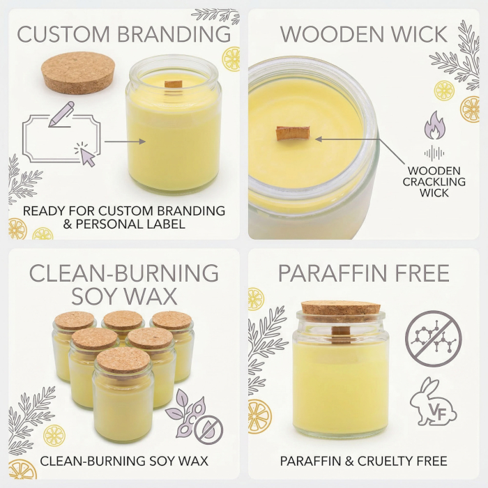 Introduci un'intramontabile fragranza di lavanda nella tua gamma di prodotti con la candela di soia con stoppino in legno "foresta e resina", in vendita all'ingrosso. Questa candela è disponibile in un formato senza etichetta, pronta per essere personalizzata, ideale per progetti di private label o concept di vendita al dettaglio personalizzati. La delicata tonalità lavanda della cera si abbina splendidamente al vasetto in vetro trasparente e al coperchio in sughero naturale, creando una presentazione semplice ed elegante che si adatta a diversi stili di branding.