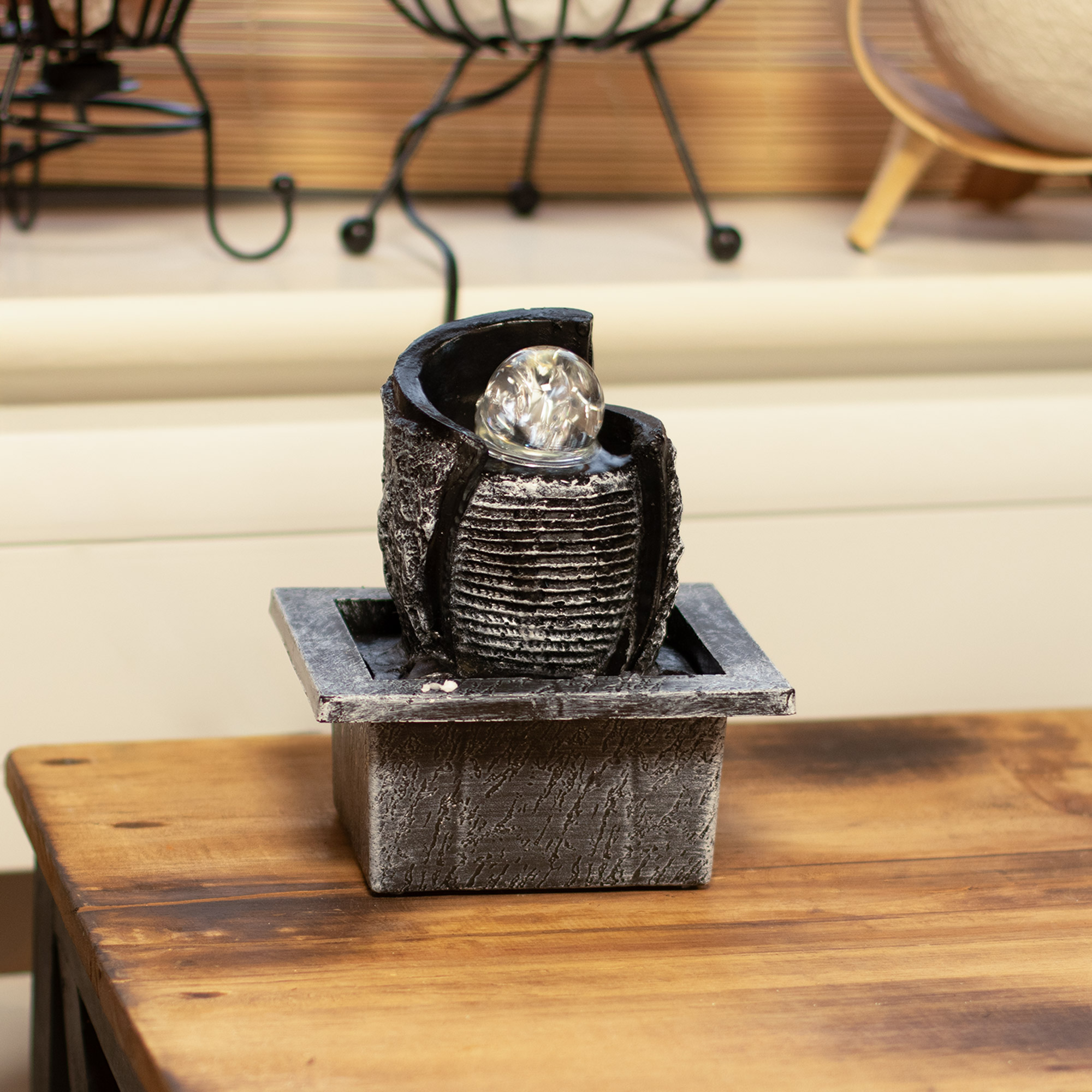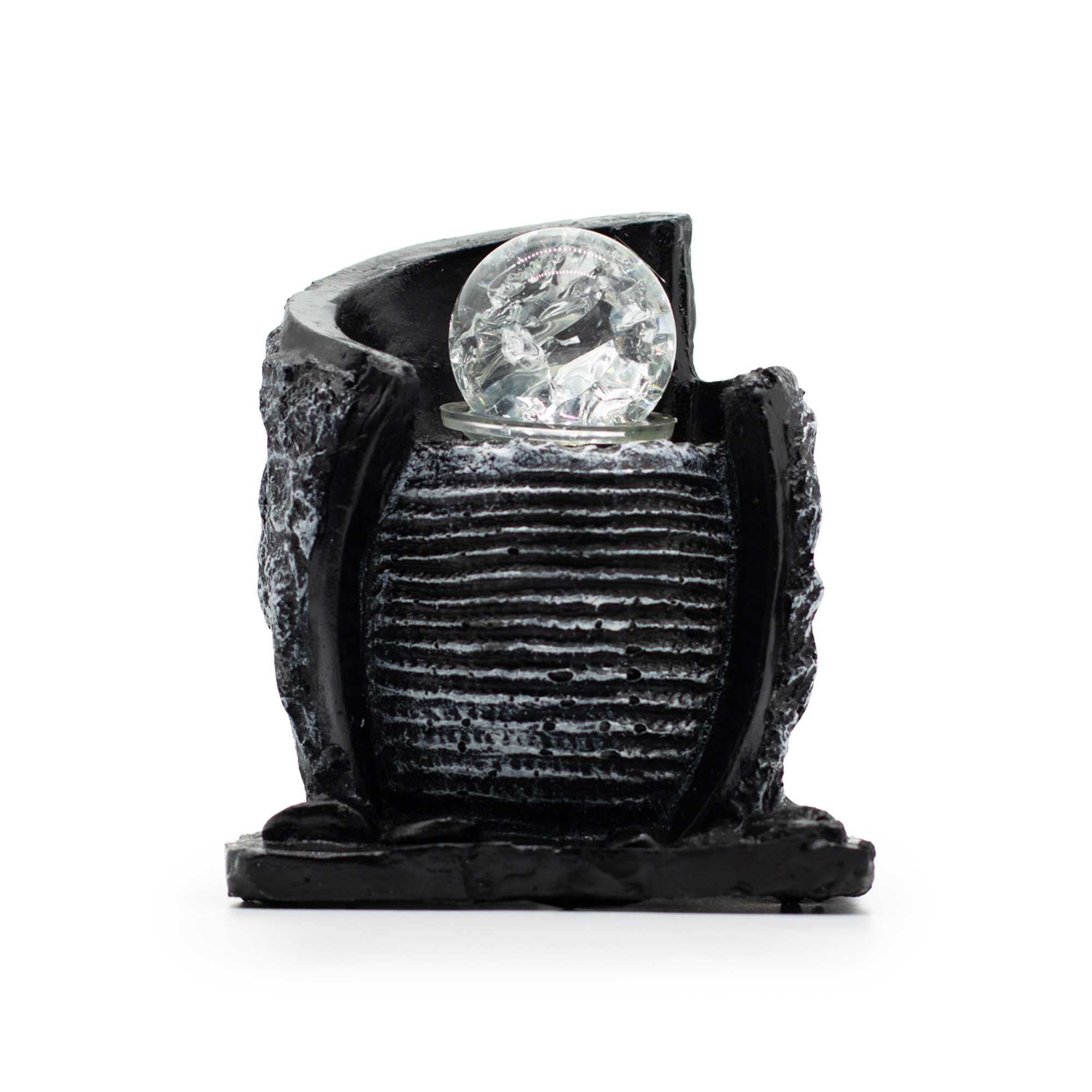 Aggiungi un tocco di calma contemporanea a qualsiasi ambiente con questa fontanella d’acqua decorativa con vaso e sfera, in vendita all’ingrosso. Progettata in uno stile scultoreo effetto pietra, la fontana presenta un vaso d’acqua scanalato incorniciato da forme rocciose testurizzate, rifinite in intense tonalità carbone per un look moderno di ispirazione zen.