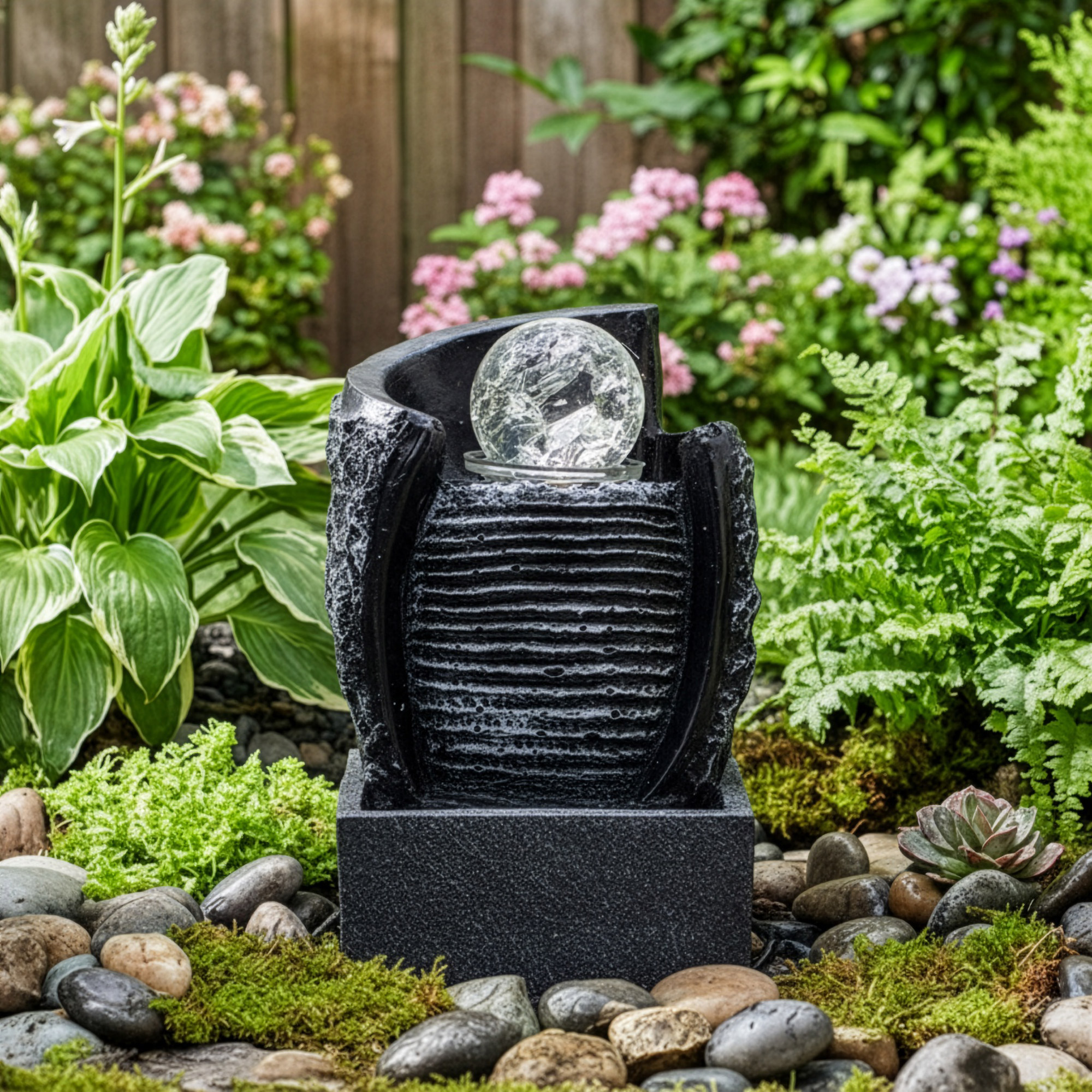 L’acqua scorre delicatamente sopra il vaso e sotto la sfera trasparente, creando un movimento rillasante e continuo che cattura la luce e aggiunge interesse visivo senza sovrastare lo spazio. La sfera diventa il punto focale del design, amplificando la sensazione di tranquillità e riflettendo luce e movimento mentre l’acqua circola.