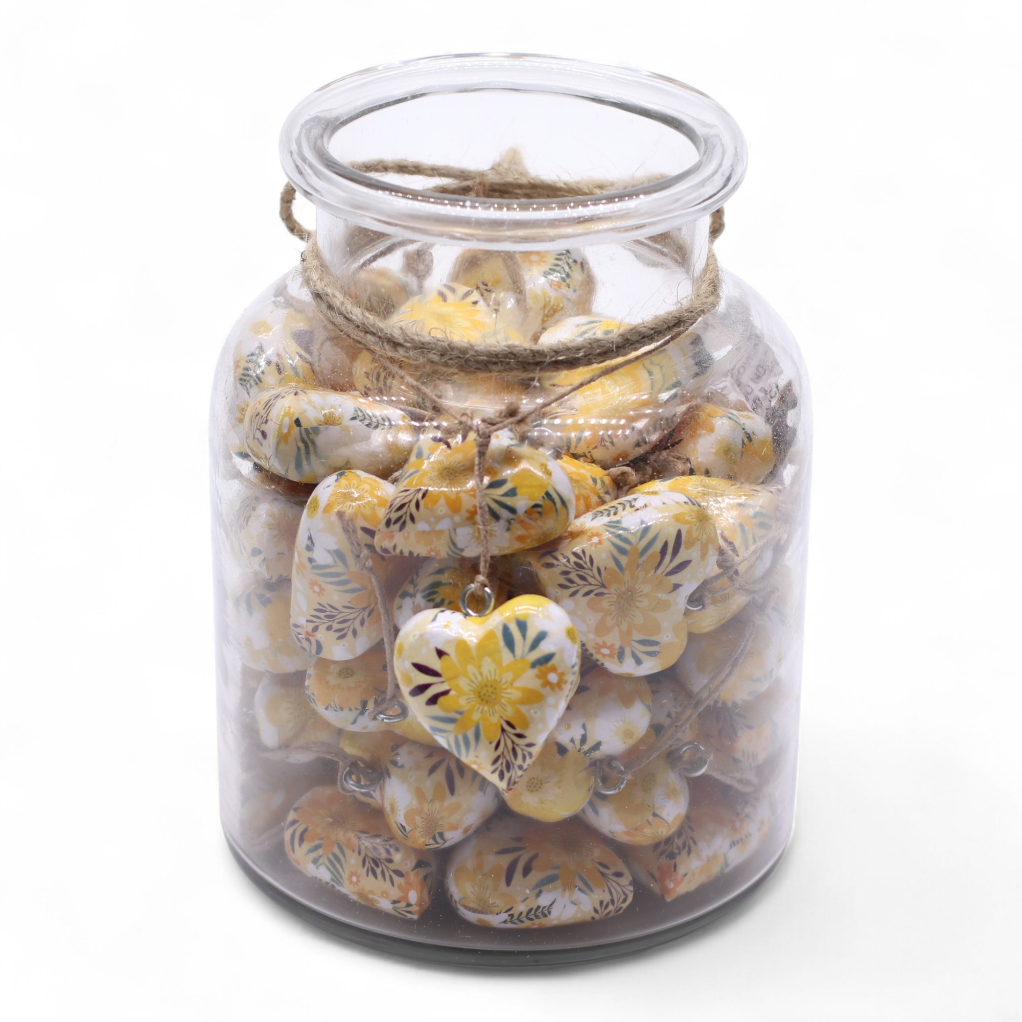 Illumina la tua esposizione stagionale con questo allegro barattolo contenente circa 50 Cuori Decorativi in Legno Yellow Floral, ognuno rifinito con un vivace motivo floreale dal gusto vintage. Il loro aspetto solare dona un tocco caldo alle decorazioni natalizie, ai regali accurati o agli accenti d’arredo più luminosi.
