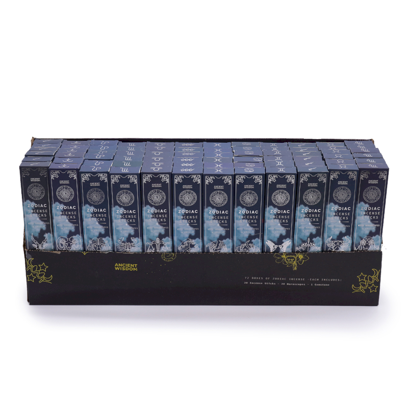 Questa linea è pensata per i rivenditori che desiderano prodotti astrologici che risultino davvero curati, regalo-friendly e commerciali. Ogni confezione zodiacale include 20 bastoncini di incenso, 20 oroscopi abbinati stampati su carta di riso e una gemma associata al segno — il tutto presentato in un packaging premium con dettagli argentati.